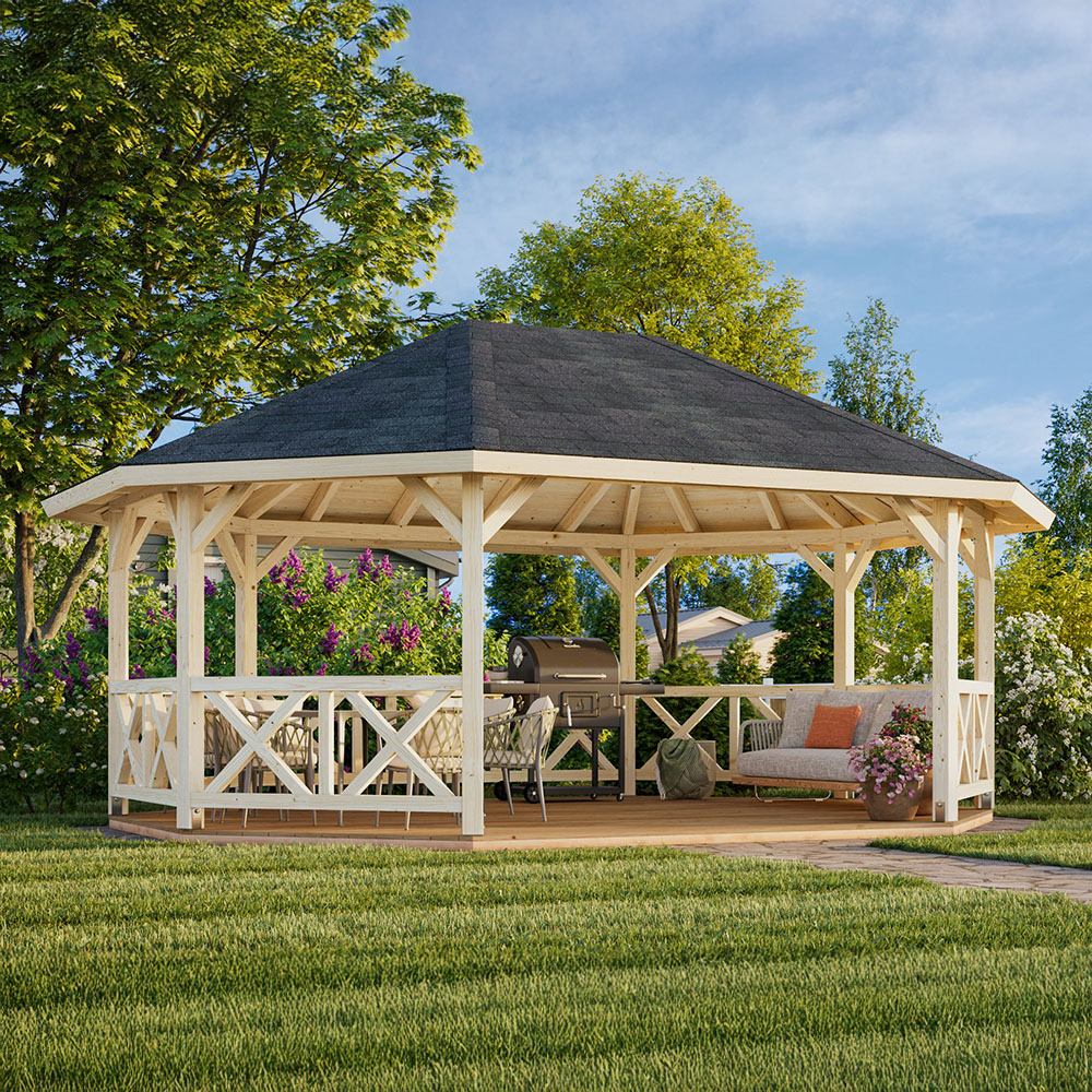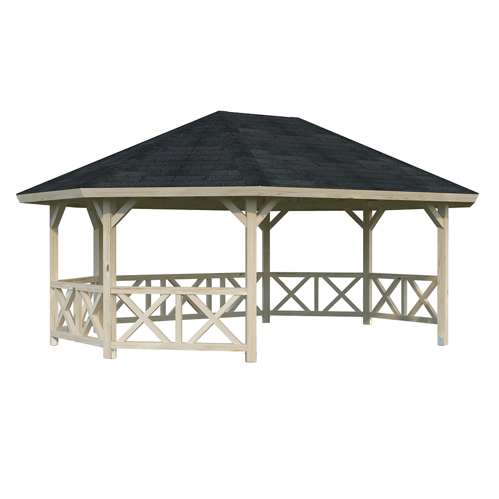 Paviljongen är obehandlad och måste grundoljas, grund- och täckmålas innan användning. Den levereras i byggsatser som du själv monterar med hjälp av utförliga monteringsanvisningar.