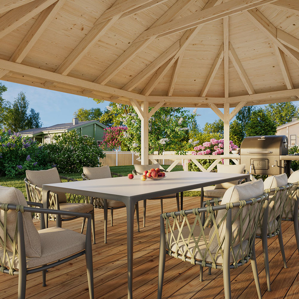 Paviljongen rekommenderas att vara placerad på ett fundament som är nedgrävt till frostfritt djup ex. egen gjutning eller på nedgrävda plintar.