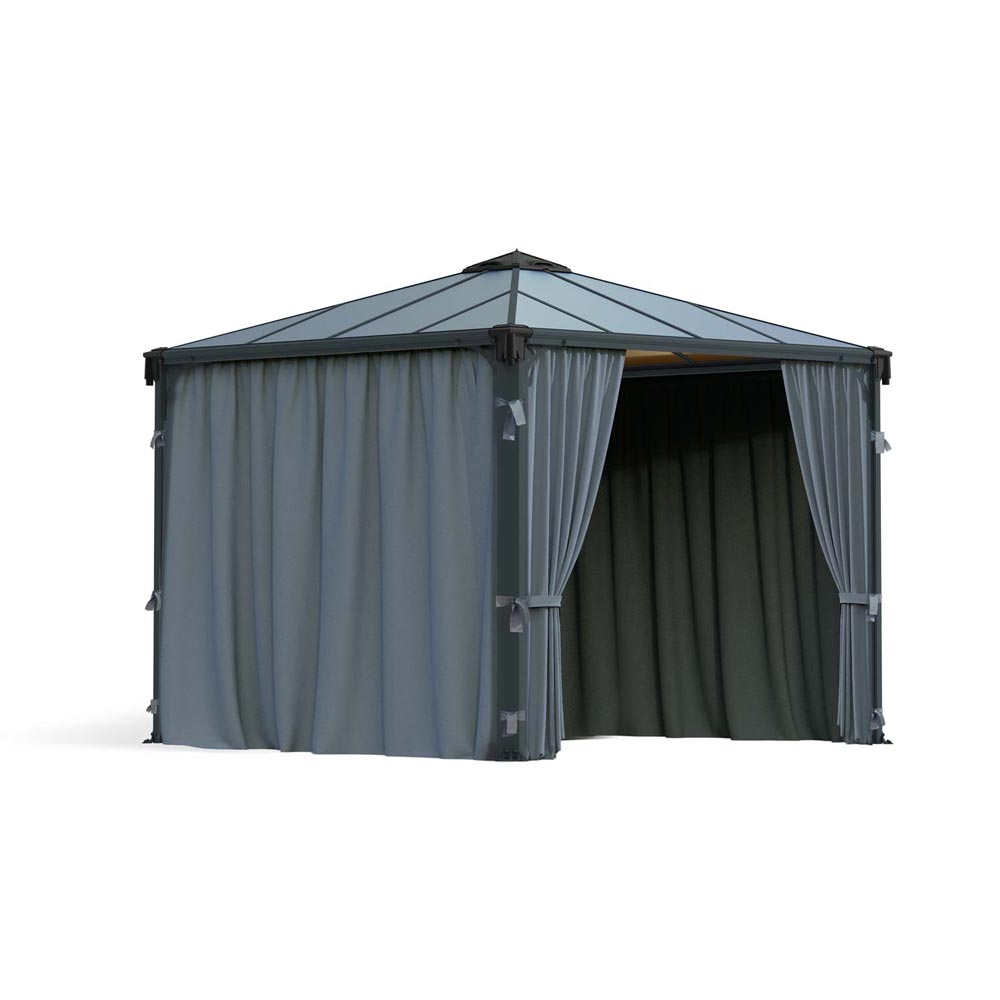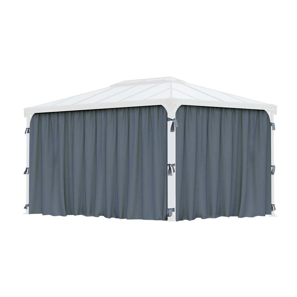 Setet innehåller fyra gardinpaneler som täcker hela paviljongen och har dragkedjor som kopplar ihop panelerna för fullständig avskildhet. Gardinerna kan enkelt knytas upp mot hörnstolparna med medföljande fästen. De är tillverkade i slitstark, vattentålig polyester och kräver minimalt underhåll – tvättas enkelt i maskin.