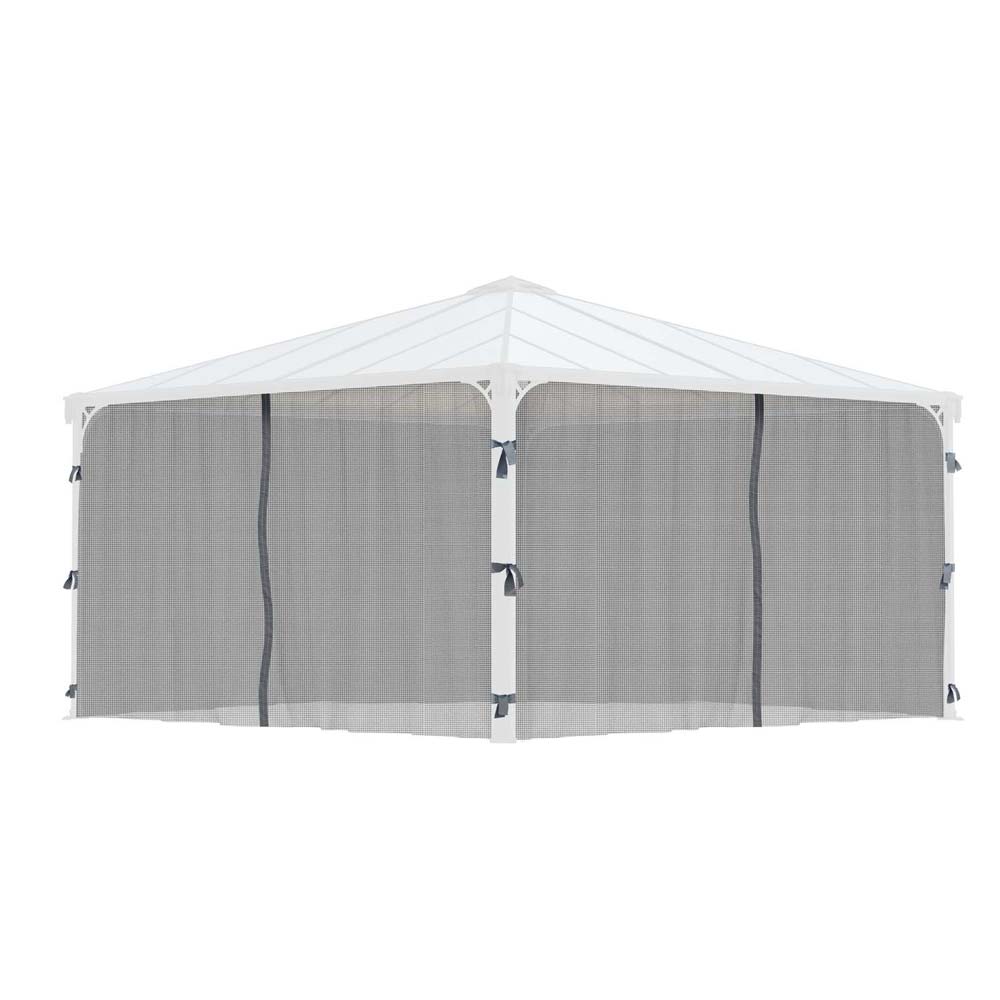 Myggnäten är tillverkade av slitstark, finmaskig polyester som enkelt fästs i paviljongens inbyggda skensystem med medföljande krokar. Panelerna har dragkedjor mellan sig för total tillslutning och kan dras åt sidan och fästas med snören när de inte används.