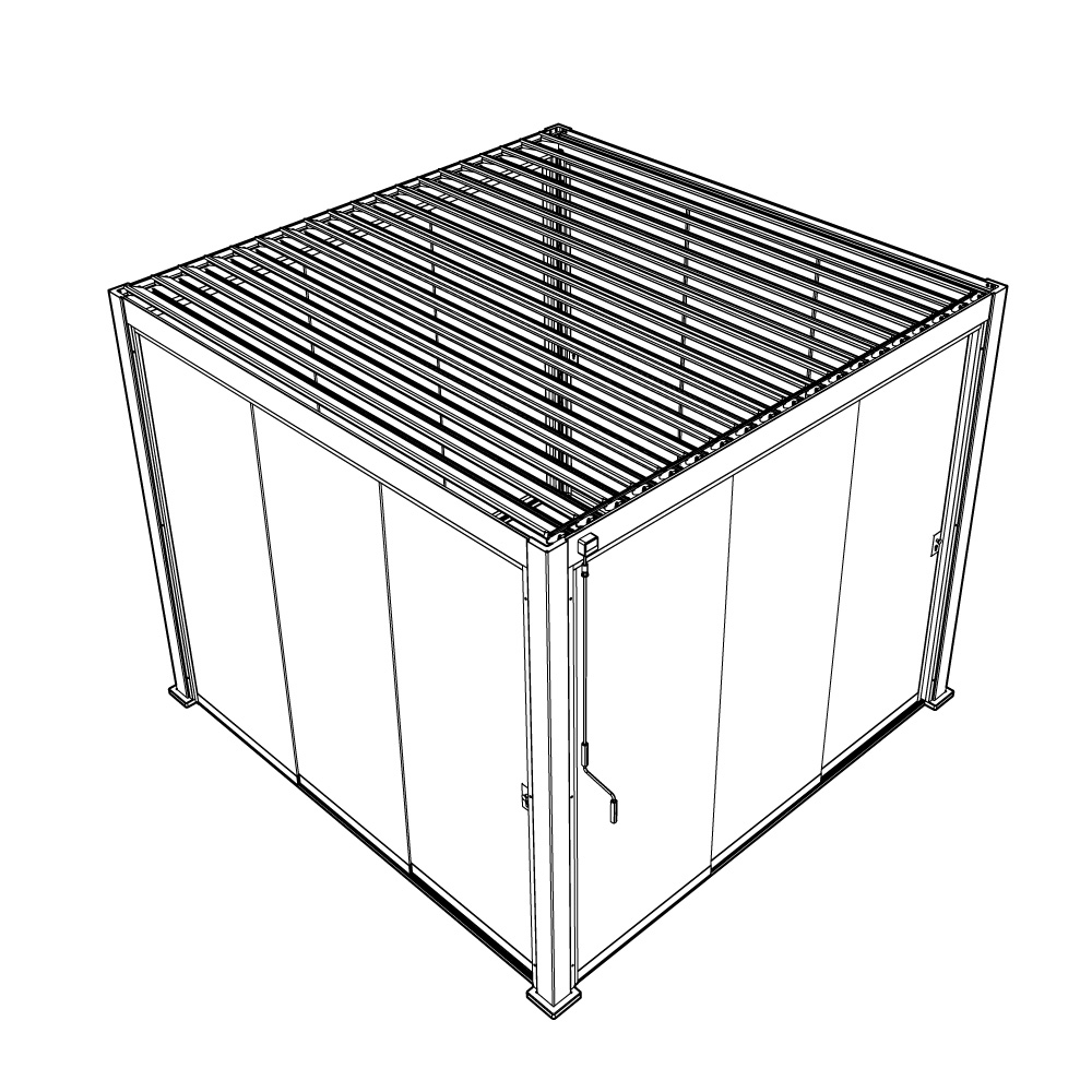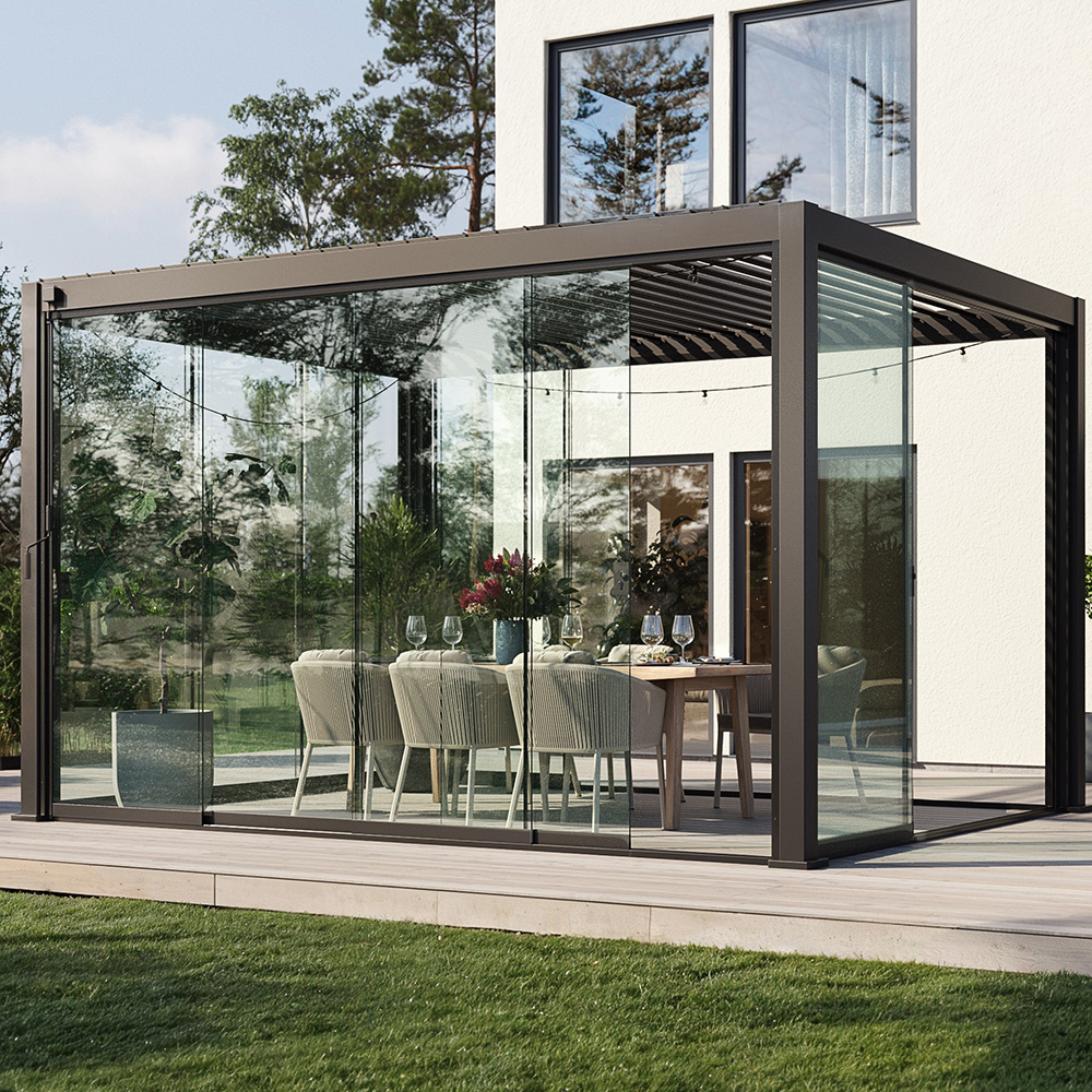Helglasad skjutvägg för dig som vill ha en pergola med stora glasytor och minimalt med synliga aluminiumprofiler. Ramlös design som prioriterar fri utsikt. Skjutväggen passar en 3-meters sektion på pergolan och består av tre luckor.