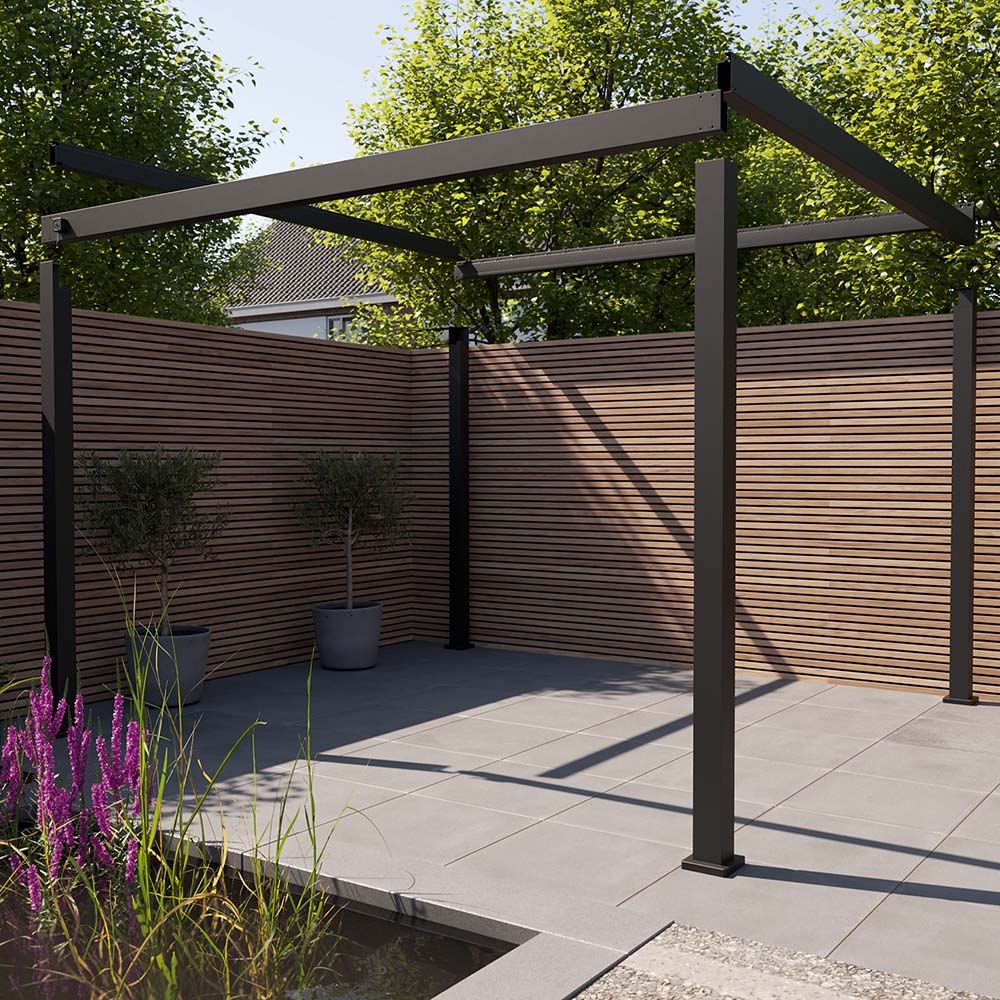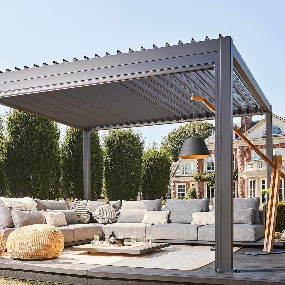 Denna unika pergola har ett fällbart lamelltak som kan skapa skön skugga eller lämnas öppet för att släppa in solen. Du har inte bara möjligheten att välja sol eller skugga utan med taket stängt får du även en skyddad plats när det börjar regna. Aluminium ger dig en enkel och underhållsfri vardag med tid för njutning.
