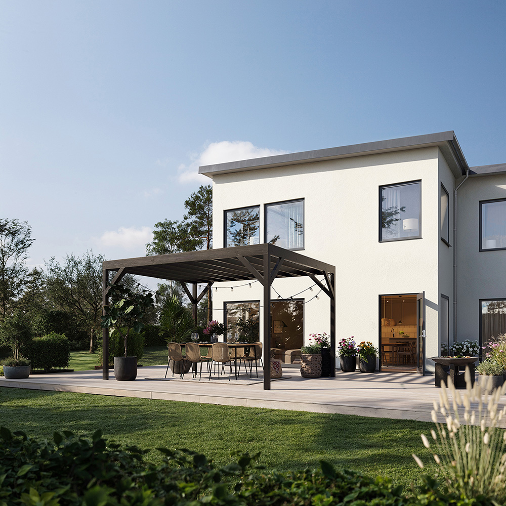 En modern, rak och ombonad pergola i limträ som kombinerar träets mjuka och varma känsla med både stil och funktion. Ditt eget krypin under bar himmel som du kan inreda med klängväxter, sköna möbler, mjuka kuddar och stämningshöjande ljusslingor.