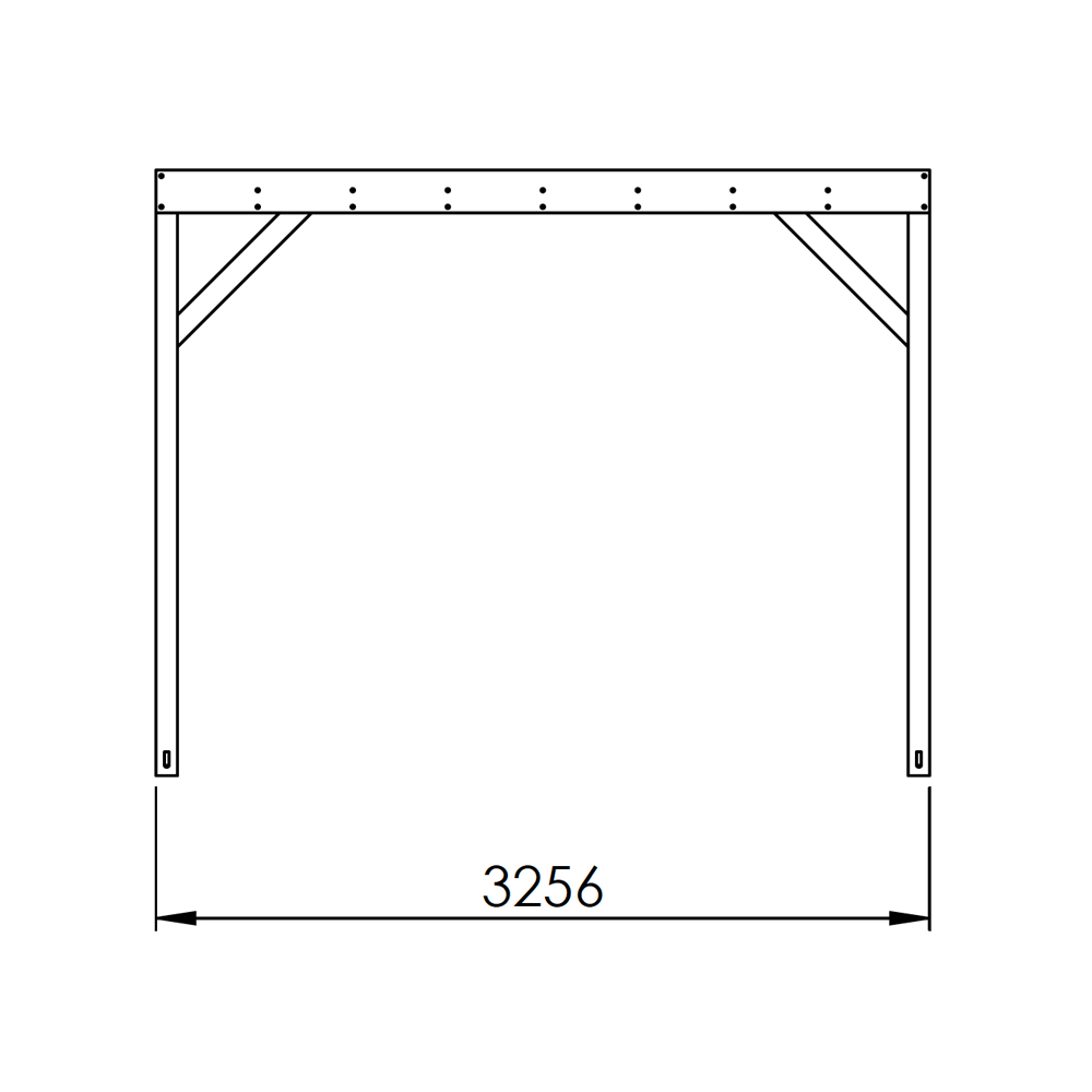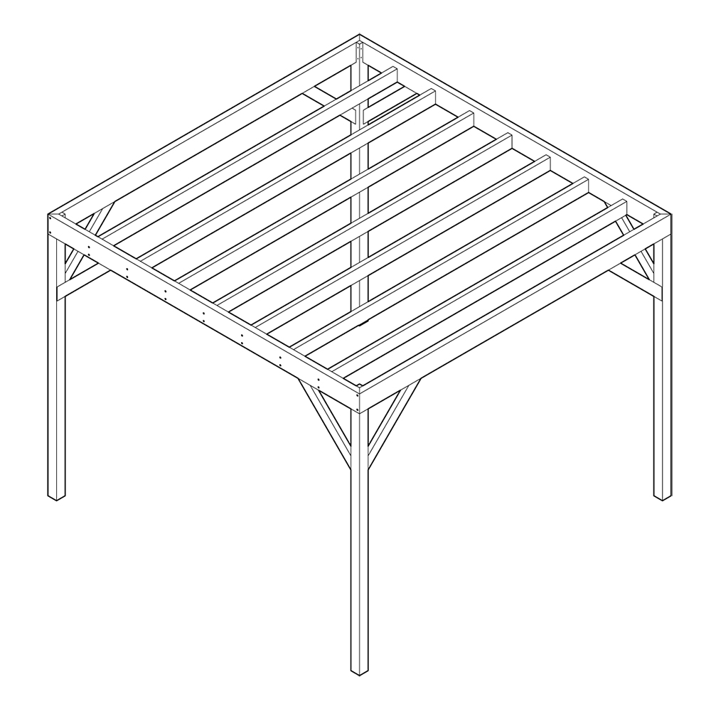 Pergolan är fyrkantig till formen - 3x3 meter (med de exakta yttermåtten 3256x3256 mm). Finns även som 3x4 meter. OBS - bilderna visar målad pergola i storleken 3x4 meter.