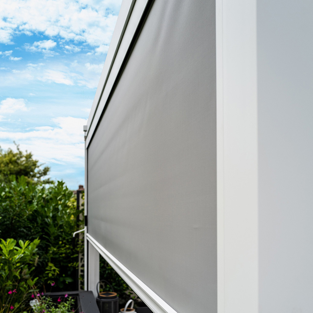 Nedfällbara sidoskärmar som ger skydd både för insyn samt väder och vind. Det perfekta tillbehöret till din aluminiumpergola när du vill njuta i skuggan eller söka skydd mot vinden. De ger även en känsla av ett rum och kan förlänga säsongen.