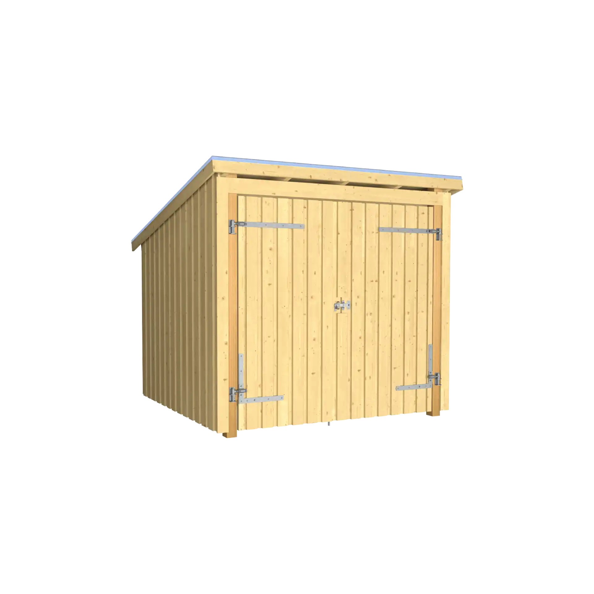 Den stängda fronten och de dubbla dörrarna ger ett tryggt och väderskyddat förvaringsutrymme, samtidigt som det nordiska formspråket med rena linjer och naturligt trä skapar ett harmoniskt intryck i trädgården.