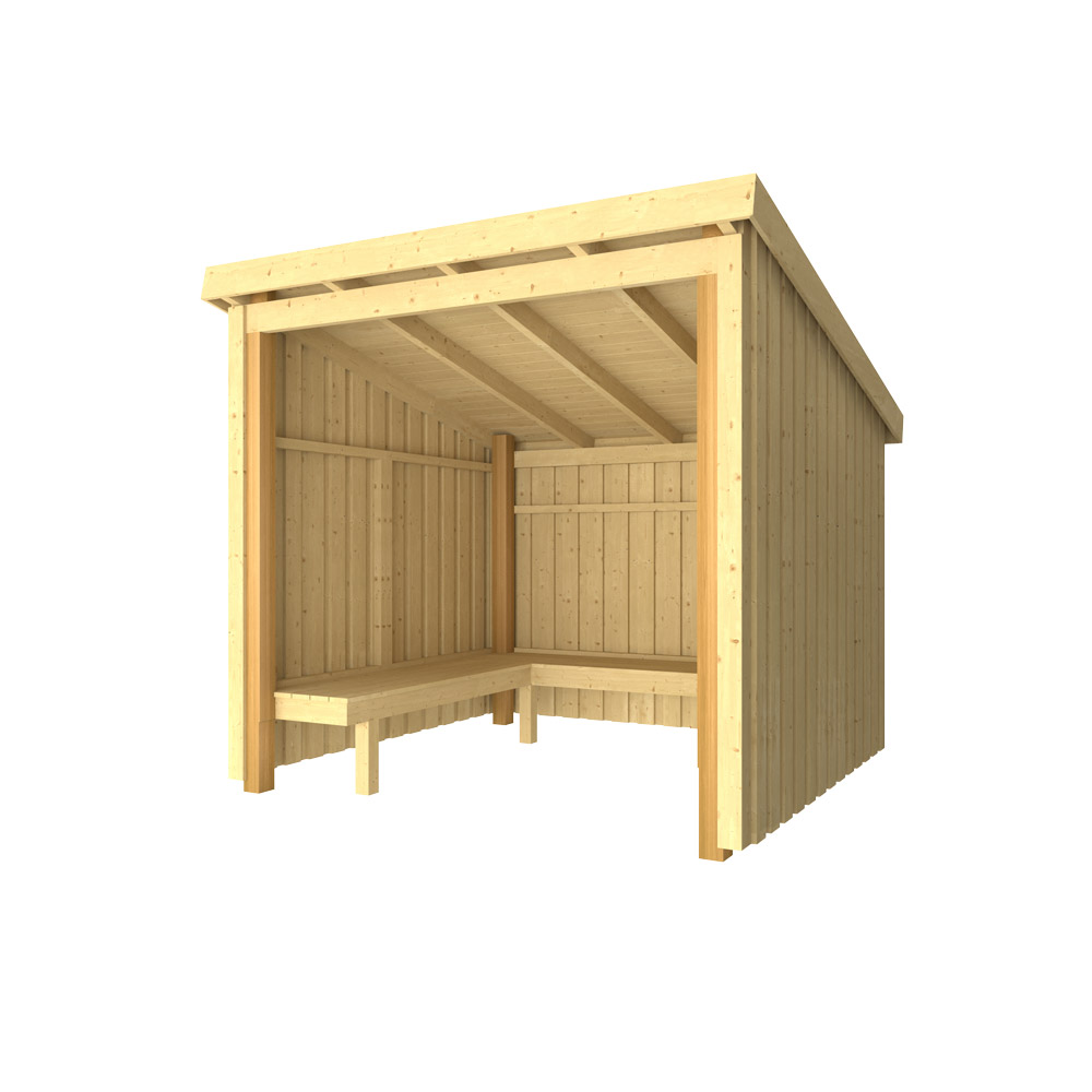 Nordic eldstuga 5 m² är en enkel och funktionell modell med öppen front och inbyggd bänk längs väggarna – perfekt som skyddad sittplats kring eldstaden.