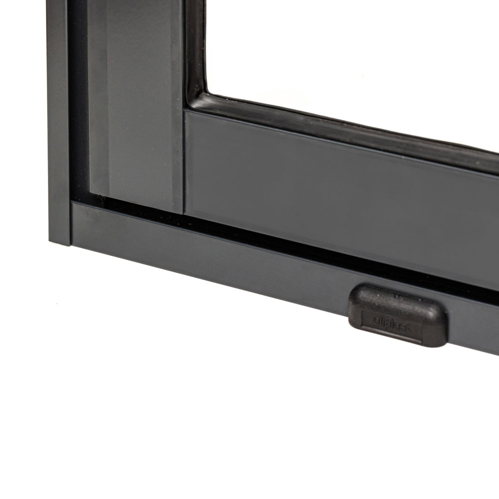 Framsidan har stora skjutdörrar i aluminium (Alu SG) med 4 mm härdat säkerhetsglas enligt specifikation. Glasytorna skapar en öppen och ljus miljö. Stugan är även utrustad med ett sidofönster på 83×160 cm. Dörröppningarnas mått är 73×186 cm, 88×187 cm och 176×187 cm. Konstruktionen kan vid behov byggas spegelvänt.