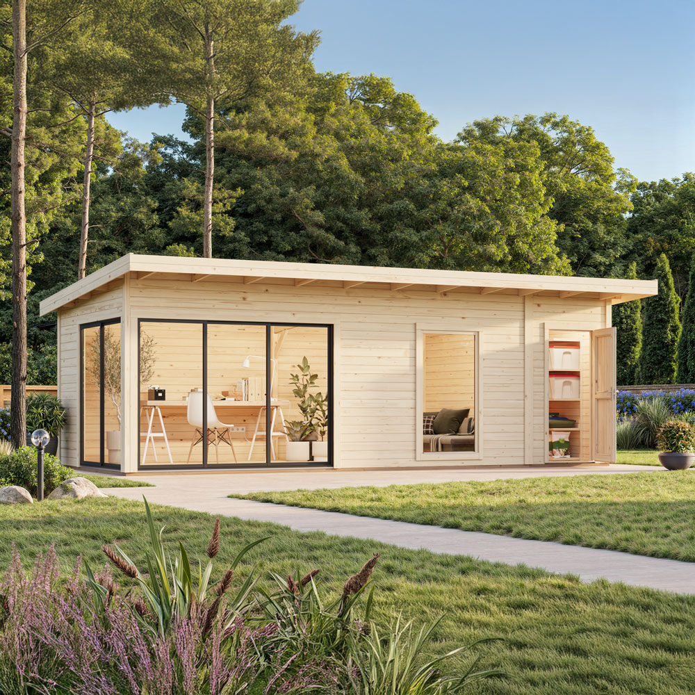 Andrea 22,1 m² Slide är en rymlig och modern kombination av en stor, ljus huvudstuga och ett praktiskt sidoförråd på 4 m². Den breda glasfasaden med skjutdörrar i aluminium gör rummet ljust och öppet och passar perfekt som gästrum, ateljé, kontor eller ett större uterum. Förrådet ger separat förvaring av verktyg, cyklar och säsongsutrustning.