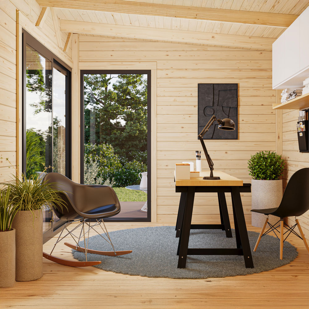 Andrea Slide Plus är tillverkat av hållbart nordiskt furu och har en väggtjocklek på 44 mm, vilket ger både stabilitet och god isolering. Det flacka pulpettaket med en lutning på 4,9° ger en modern profil och effektiv vattenavrinning. Huset levereras med ett 19 mm tjockt trägolv och har ett generöst taköverhäng på 60 cm framtill, vilket ger extra skydd mot väder och vind.