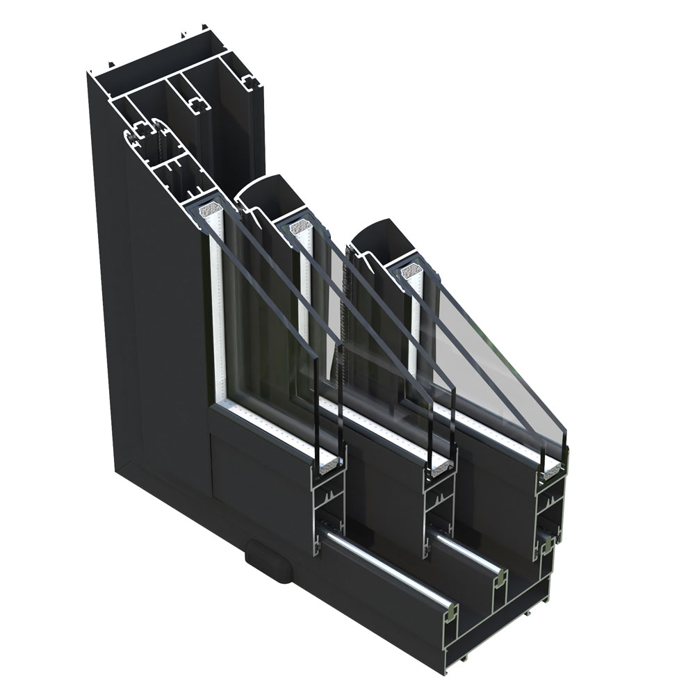 De stora fasta fönstren och skjutdörrarna är utrustade med 24 mm härdat dubbelglas (4-16-4), vilket säkerställer god isolering och ljusinsläpp. Skjutdörrarna i aluminium är försedda med ett profilcylindrerlås för ökad säkerhet.