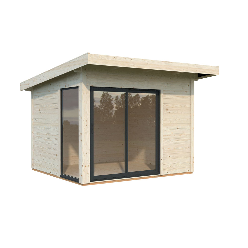 Andrea Slide Plus är tillverkat av hållbart nordiskt furu och har en väggtjocklek på 44 mm, vilket ger både stabilitet och god isolering. Det flacka pulpettaket med en lutning på 4,9° ger en modern profil och effektiv vattenavrinning. Huset levereras med ett 19 mm tjockt trägolv och har ett generöst taköverhäng på 60 cm framtill, vilket ger extra skydd mot väder och vind.