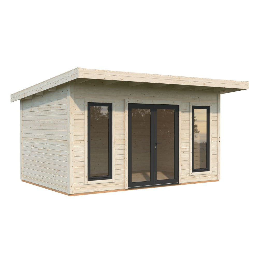 Aurelia 13,4 m² är en modern och välbalanserad trädgårdsstuga med stora glasytor och ett elegant pulpettak. Den generösa fronten i glas gör modellen perfekt som hemmakontor, hobbyrum, gästrum eller ett extra rum för avkoppling. Med 44 mm väggprofiler och högkvalitativa aluminiumdetaljer får du en solid och långlivad konstruktion.