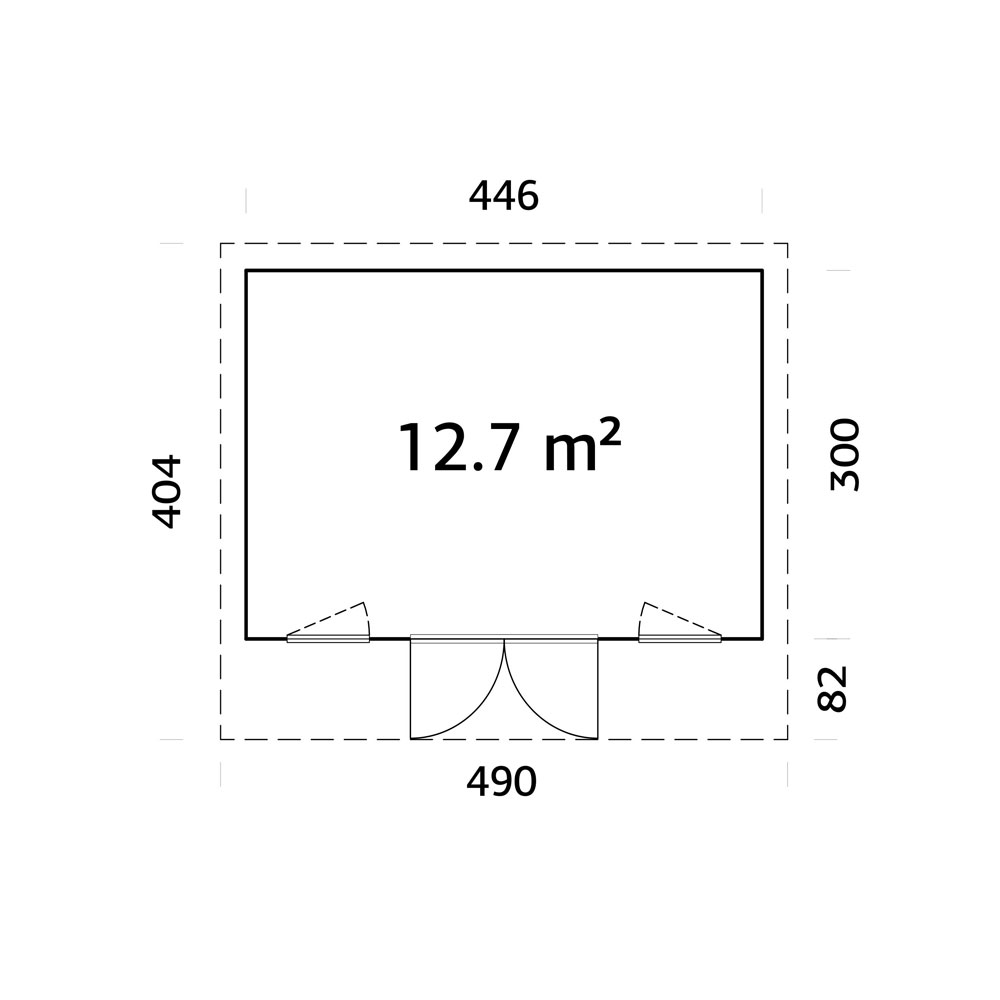Byggmåtten är 446×300 cm, med en totalhöjd på 264 cm. Pulpettaket har 4,4° lutning och en takyta på 19,4 m², monterad med 19 mm spontade takbrädor.