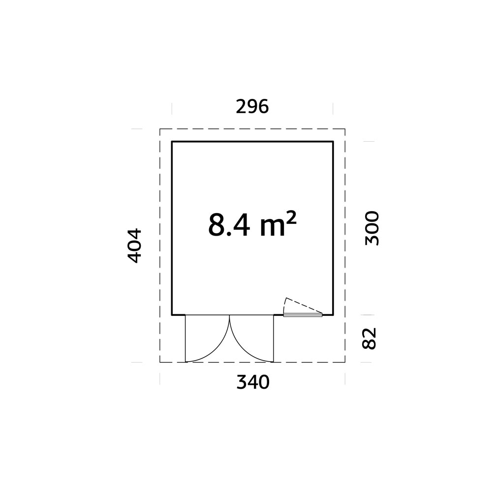 Byggnadens mått är 296×300 cm, vilket bekräftas i planritningen (sid. 5 och 12) . Den totala höjden är 264 cm, och det moderna pulpettaket har 4,4° lutning. Takyta: 13,4 m², byggt med 19 mm spontade takbrädor.