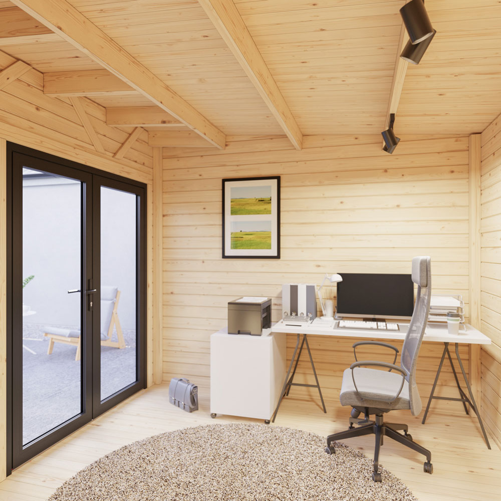 Aurelia 8,9 m² är en ljus och modern stuga med generös glasad front och ett stilrent pulpettak. Den kompakta planlösningen gör modellen idealisk som hemmakontor, ateljé, gästrum eller ett extra rum i trädgården. Med 44 mm väggprofiler och aluminiumdetaljer får du ett stabilt och hållbart byggnadsskal med lång livslängd.
