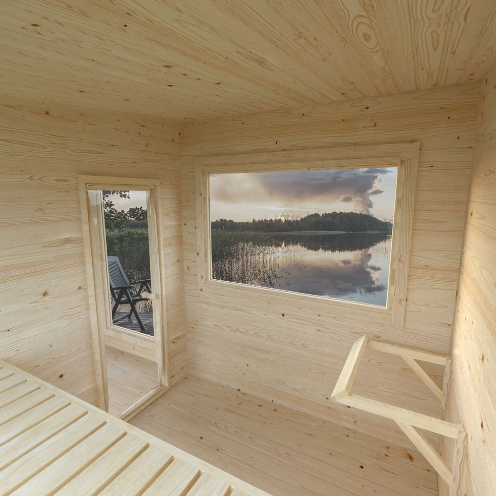 Med en bastudel på 6,8 m2 kan du njuta av en traditionell bastuupplevelse av hög kvalitet, perfekt för avkoppling och välbefinnande. Entrén är perfekt för ombyte innan och efter bastubadet. Den ger också en bekväm plats för att hänga upp blöta handdukar och hålla basturummet rent och snyggt.