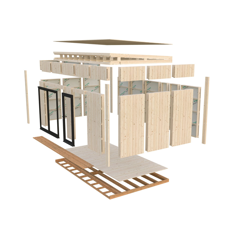 Johanna levereras som ett byggsatskit med färdigmonterade väggsektioner, tak- och golvbrädor samt kompletta dörrpartier. Du följer den stegvisa monteringsanvisningen och bygger upp stommen med väggblock, takstolar och panel. Stugan levereras obehandlad, så du kan själv välja kulör och ytbehandling som passar din tomt och ditt hus.