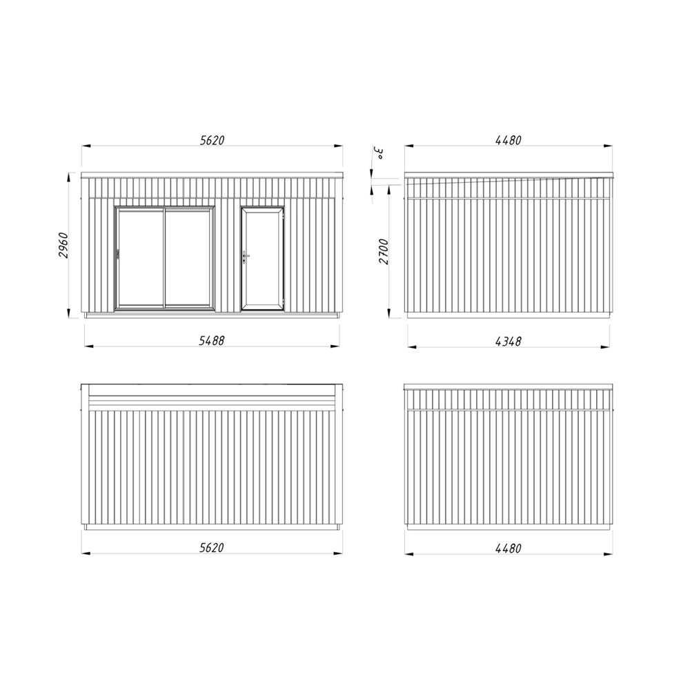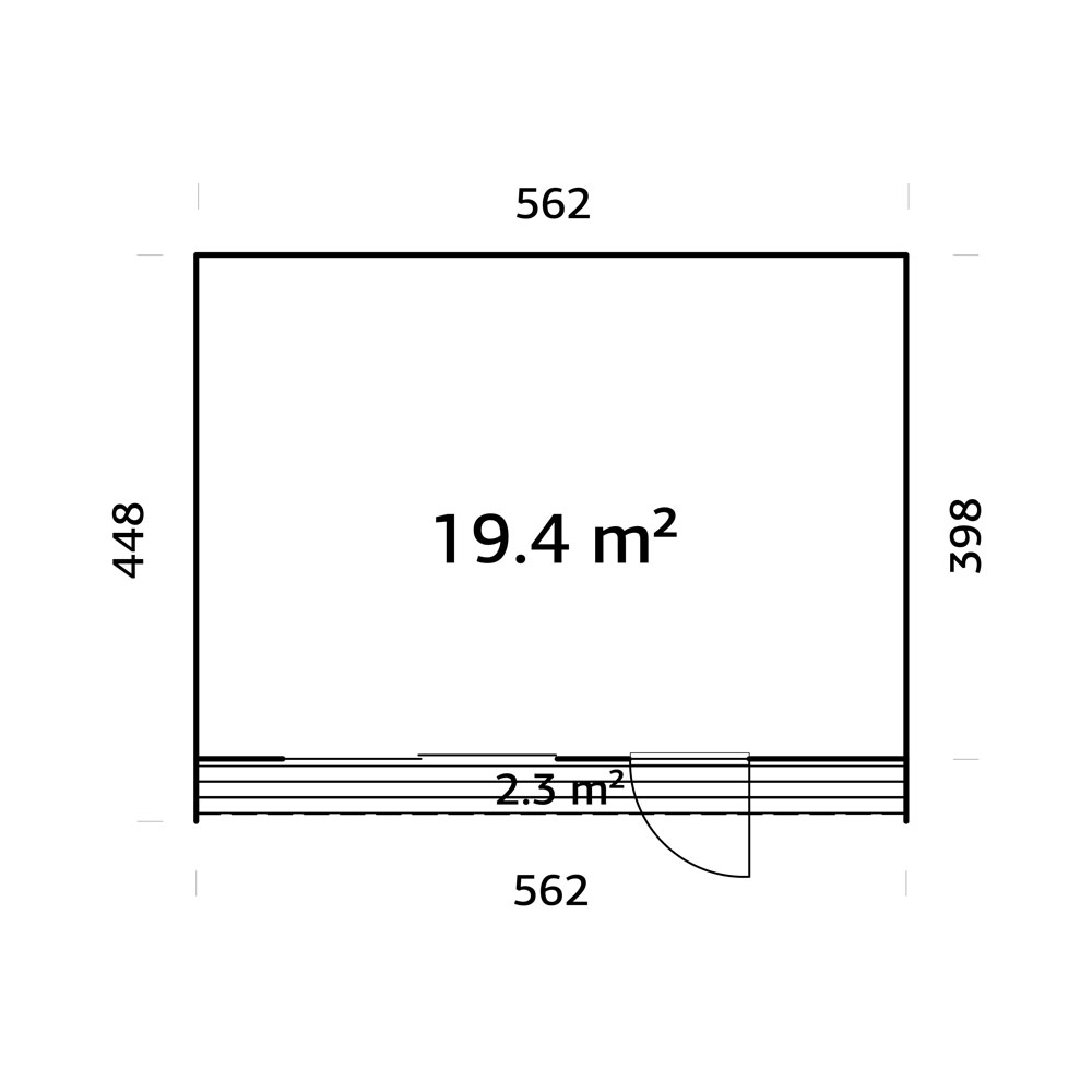 Byggnaden tillverkas av förmonterade väggelement i 18 mm nordisk gran, vilket gör monteringen snabb och stabil. Väggelementen levereras med vindskyddande plast som standard, vilket ger bättre skydd mot fukt och drag. Stugan mäter 562×448 cm och har en vägghöjd på 270 cm, vilket ger en öppen och rymlig invändig känsla. Totalhöjden är 296 cm.