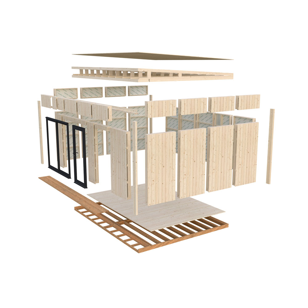 Stugan levereras som ett komplett byggsatskit med färdiga väggblock, takbjälkar, paneler, golvbrädor och dörrpaket. Monteringen sker stegvis med hjälp av tydliga instruktioner. Konstruktionen är utformad för att vara enkel att montera även för dig som inte byggt tidigare. Johanna levereras obehandlad, så du kan själv välja färg och ytbehandling som passar ditt hus och trädgård.