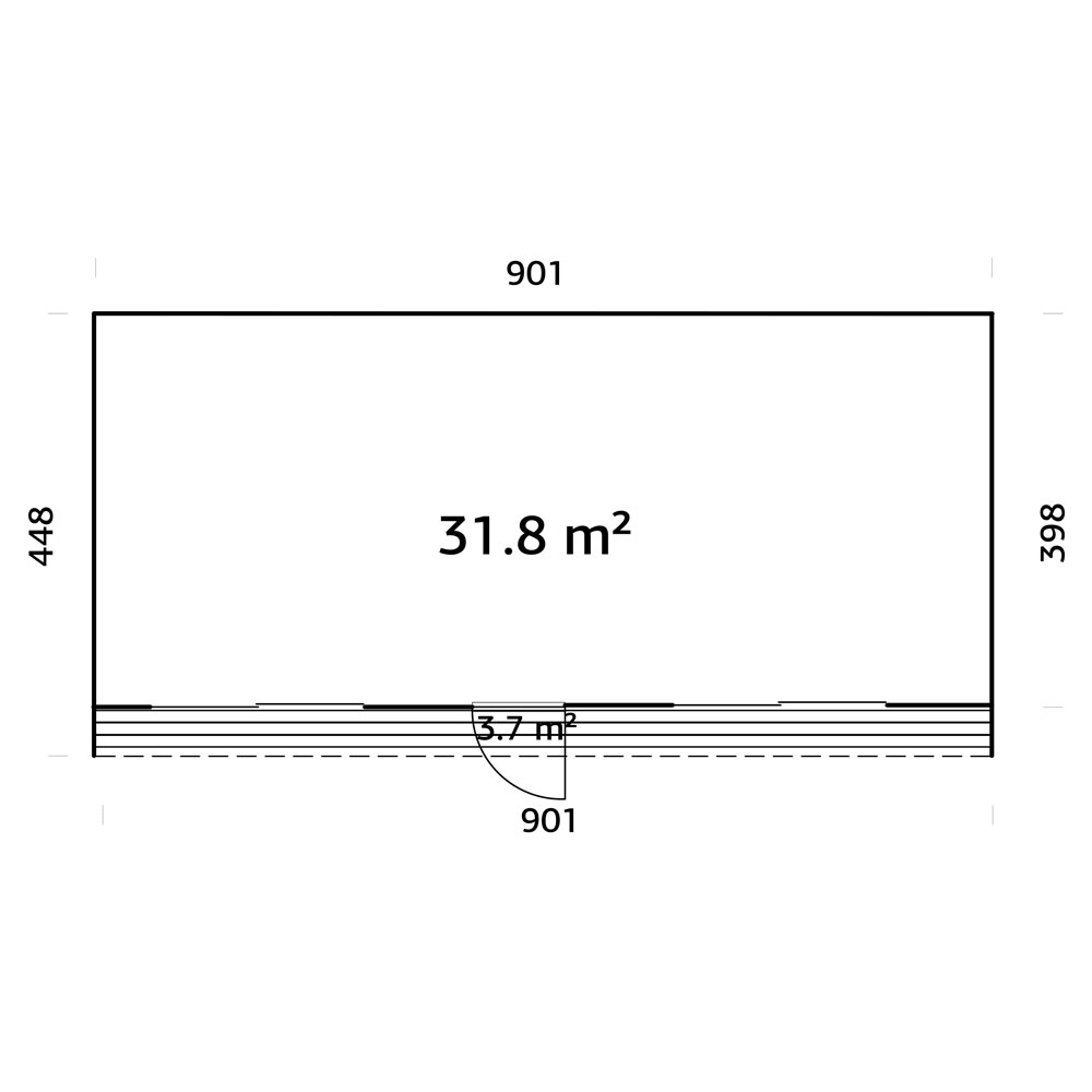 Byggnaden mäter 901×448 cm, med en vägghöjd på 270 cm och en totalhöjd på 296 cm. Det flacka pulpettaket har en lutning på 3° och en takyta på 39,0 m², byggd med 19 mm spontade takbrädor. Även golvet består av 19 mm spontade golvbrädor, vilket ger en stabil och hållbar golvkonstruktion.