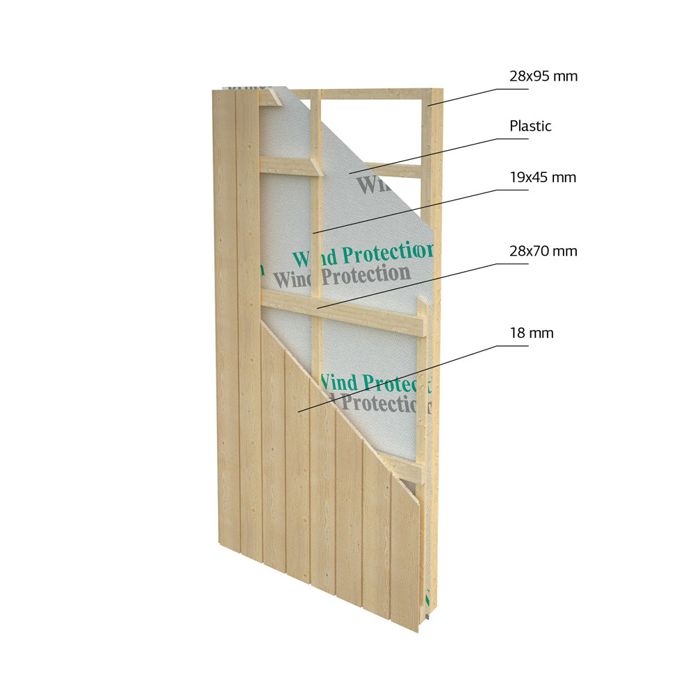 Johanna byggs av förmonterade väggelement i 18 mm nordisk gran, vilket gör monteringen snabb och ger stugan hög formstabilitet. Väggblocken är utrustade med vindskyddande plast för att minska drag och ge bättre väderskydd.