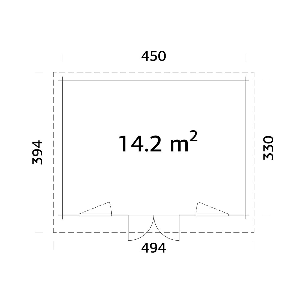 Byggmåtten är 450×330 cm, med en totalhöjd på 244 cm, vilket gör byggnaden godkänd för installation under 2,5 meter. Taket är ett modernt pulpettak med 4° lutning och en takyta på 19,2 m², byggt med 19 mm spontade takbrädor.