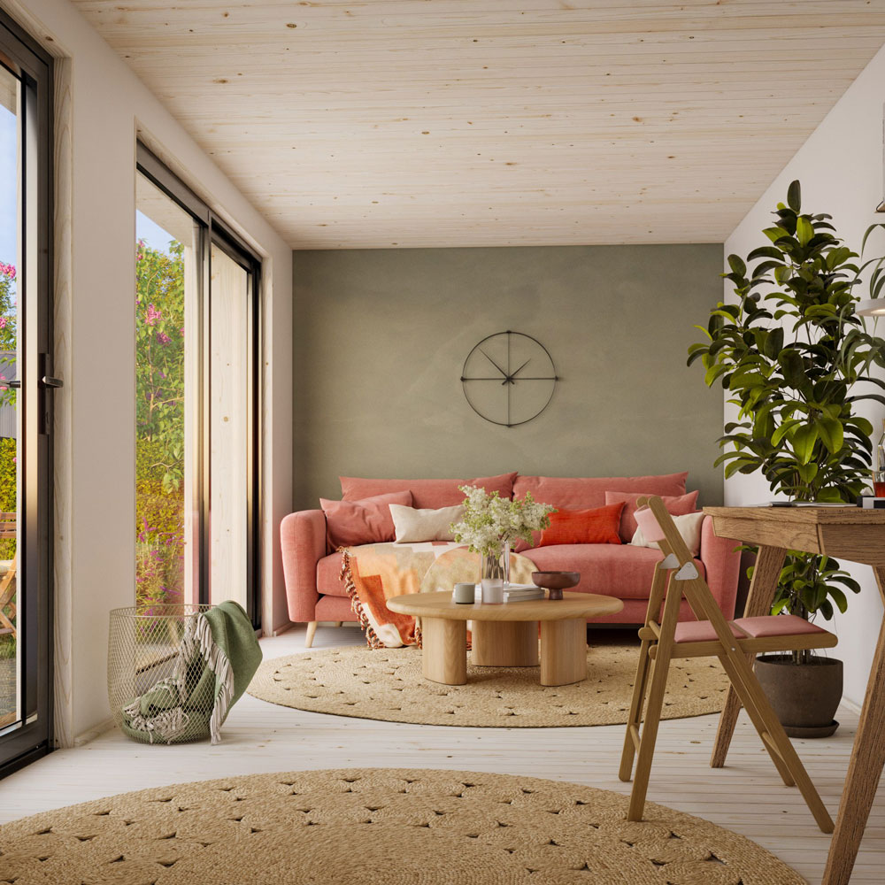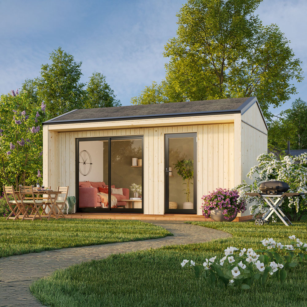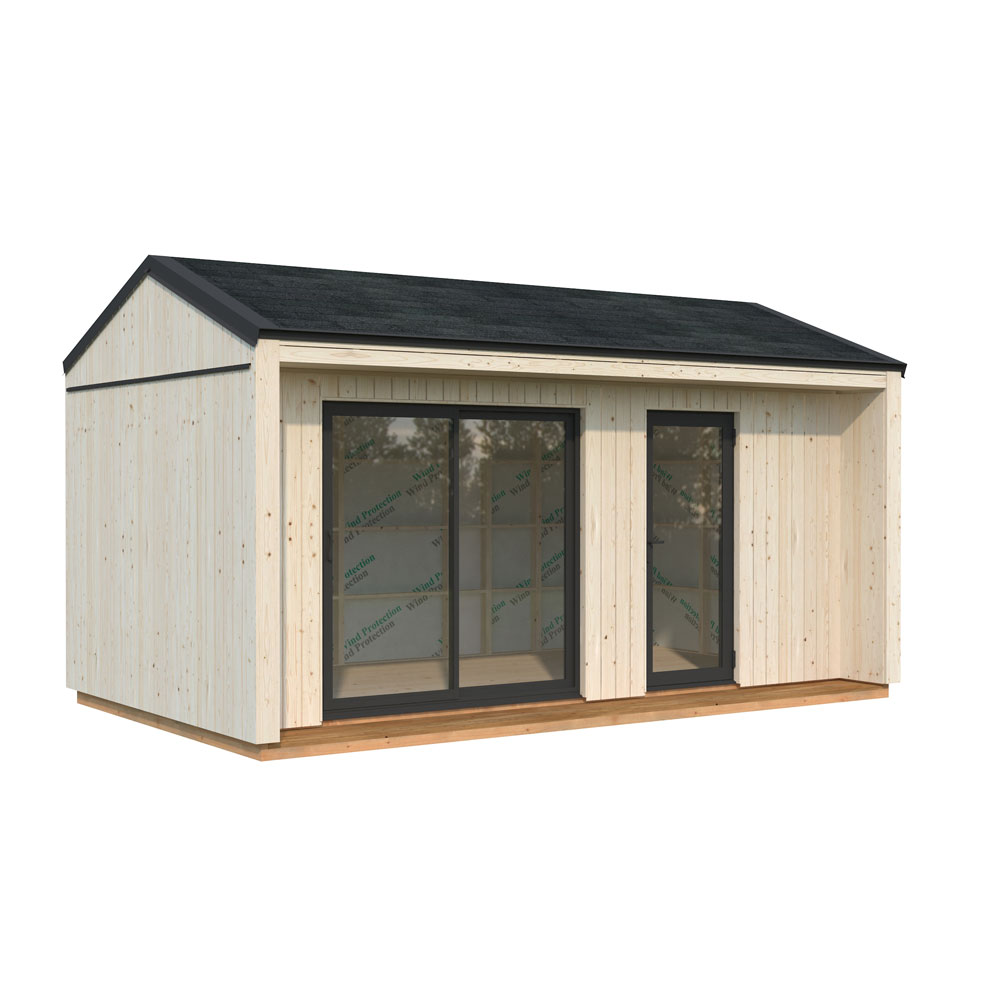 Rebekka 13,6 m² har två entréalternativ i aluminium, båda med double toughened glass (dubbelhärdat isolerglas) som ger ett tryggt och hållbart ljusinsläpp.