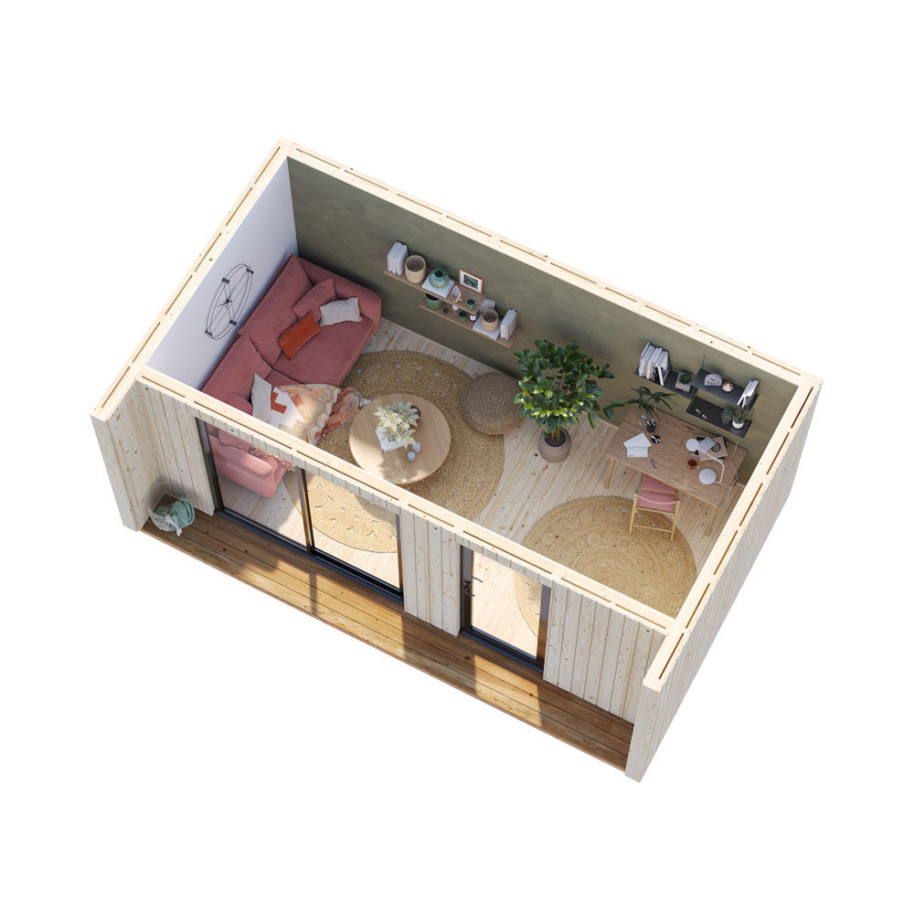 Stugan byggs av förmonterade väggelement i 18 mm nordisk gran, vilket gör monteringen snabb och stabil. Samtliga väggblock levereras med vindskyddande plast, vilket minskar drag och skyddar konstruktionen från väta.