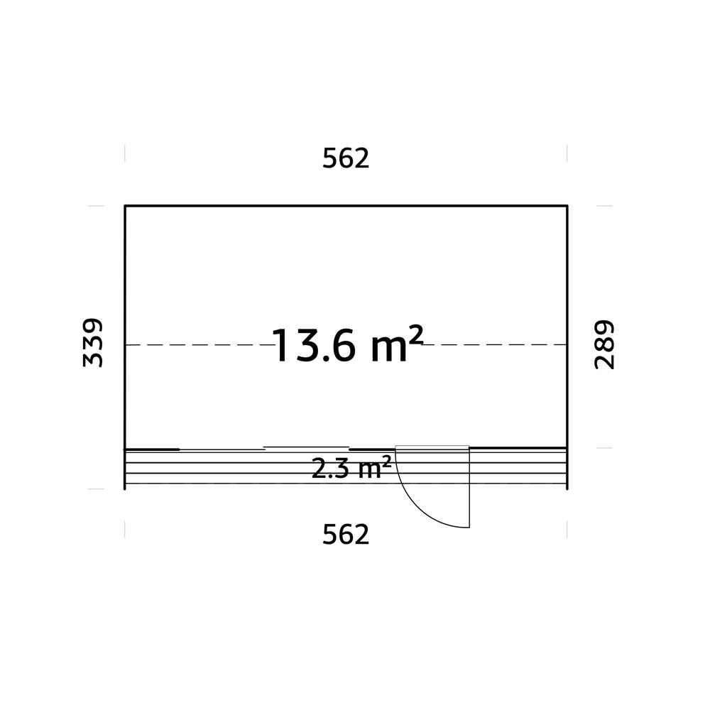 Rebekka mäter 562×339 cm och har en imponerande vägghöjd på 256 cm samt en totalhöjd på 328 cm. Det branta sadeltaket har en lutning på 20° och en takyta på 21,0 m², byggt med 19 mm spontade takbrädor. Golvet består av 19 mm spontade golvbrädor för en stabil grund.