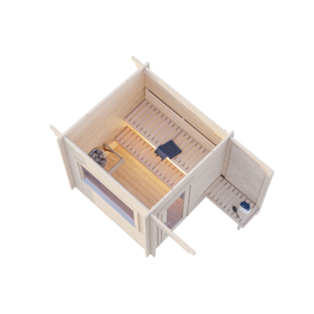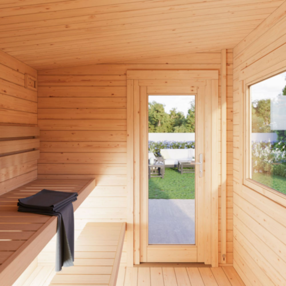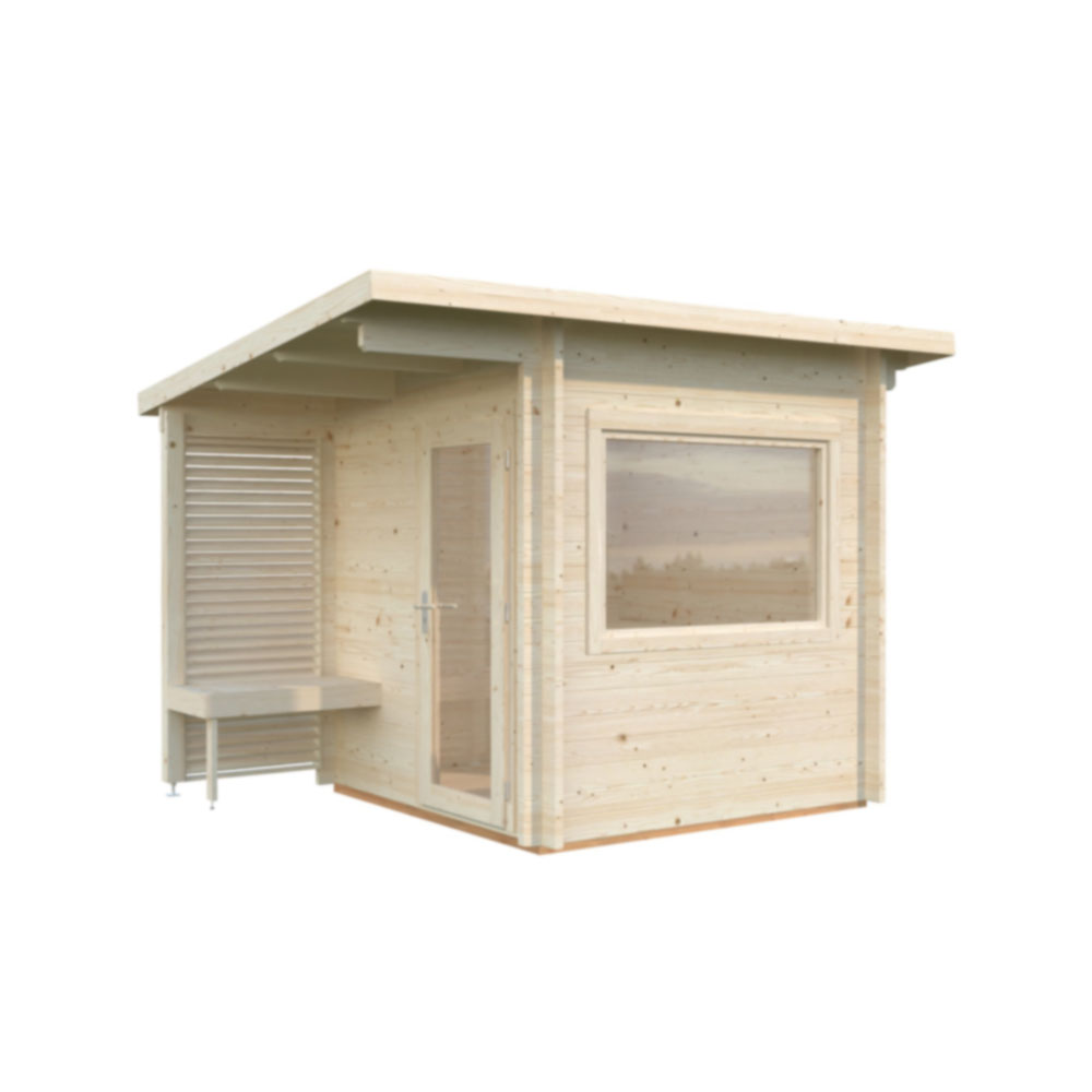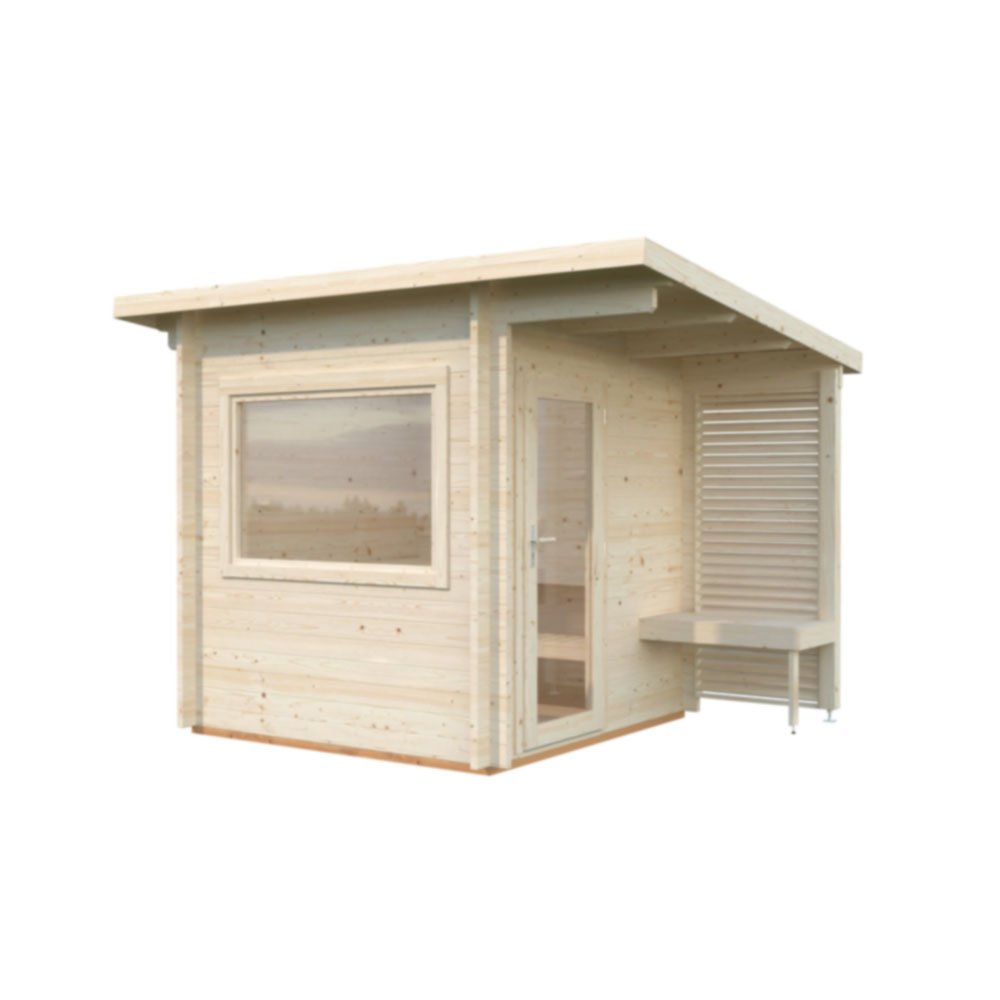 Sanna 4,4 m² är en kompakt och genomtänkt bastustuga med modern design, stora glasytor och en stabil konstruktion i 44 mm massivt trä. Trots sin lilla yta rymmer modellen både basturum och sittplatser, vilket gör den perfekt för mindre tomter eller som en extra spa-yta vid huset eller stugan. Den låga totalhöjden gör den enkel att placera även där höjdkrav gäller.
