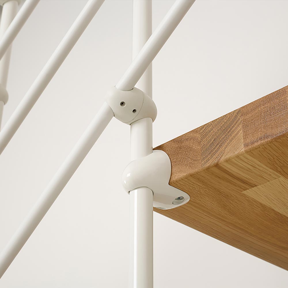 Stommen finns i 2 olika kulörer vit och mörkgrå. Trappstegen är i ljus massiv ek.