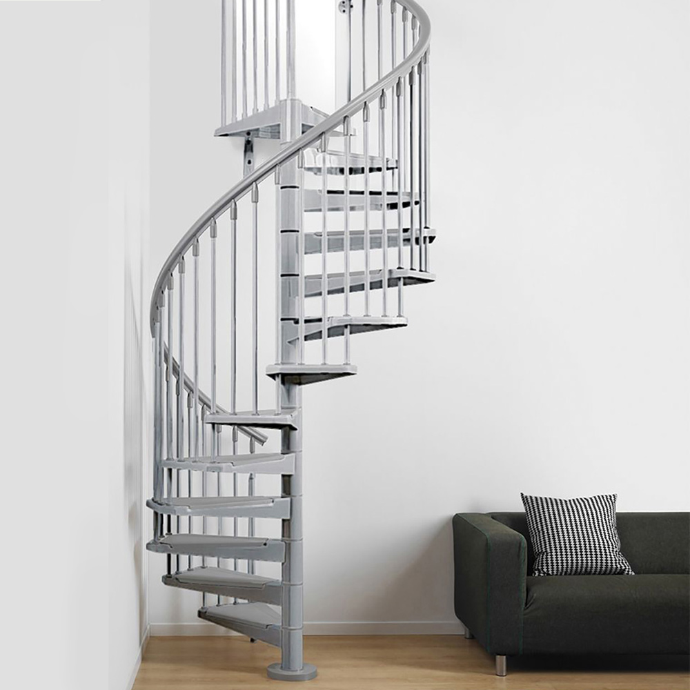 Trappan har en rund utformning bestående av avståndsdelare i lackerat stål. Räckena är även dem i lackerat stål och har samma nyans som stommen. Handledaren är gjord i tålig PVC.