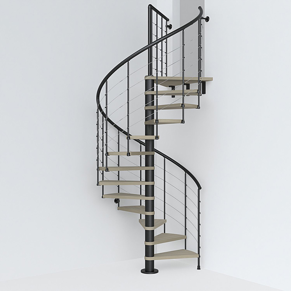 Trappan har en rund utformning bestående av avståndsdelare i lackerat stål som monteras mellan trappstegen. Räckena är i lackerat stål som har samma färg som stommen. Även handledaren har samma nyans och är gjord i tålig PVC. Räckesståndarna är sammanlänkade av fem tvärgående stänger i rostfritt stål som ger ett modernt utseende på trappan.