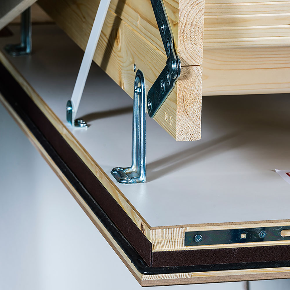 Denna smidiga trappa gör att du kan utnyttja vindens förvaringsutrymme på bästa sätt. Den viks enkelt ihop i tre sektioner på luckans insida och tar därför mycket liten plats.
