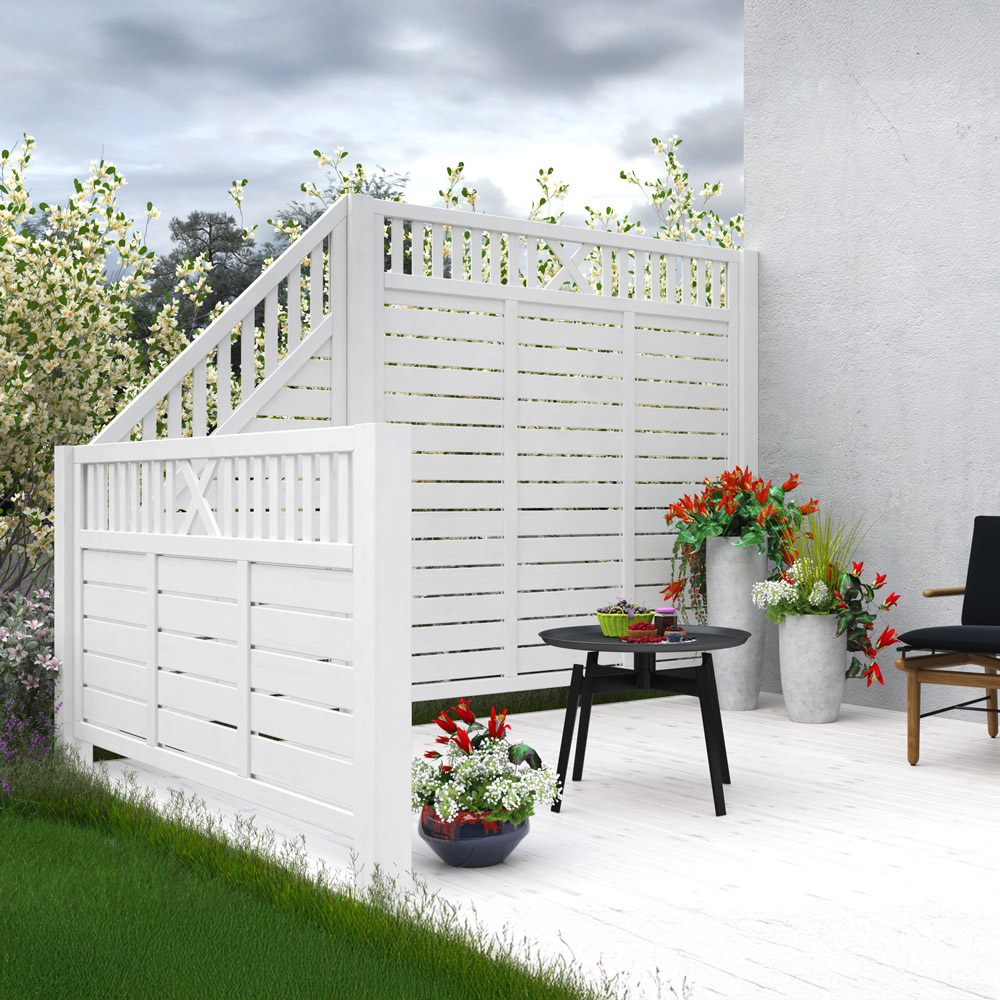 Panelmåtten är fasta. De vanligaste höjderna är 180, 150 och 90 cm. Bredden är oftast 180 eller 90 cm. Du kan också välja sektioner där höjden trappar ner mot ena sidan. Det gör det lätt att anpassa skärmen till nivåskillnader och hörn.