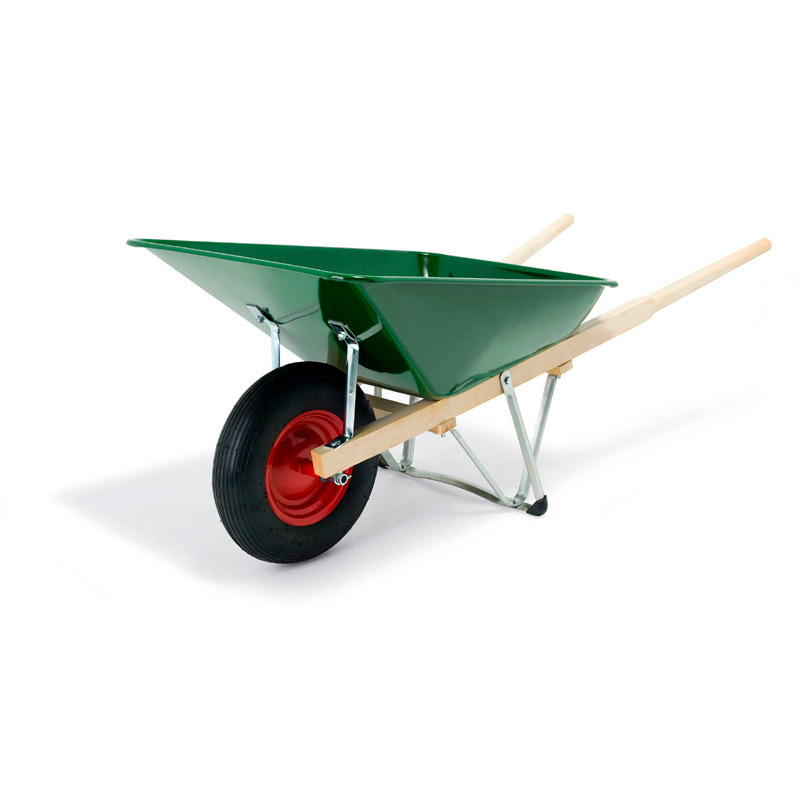 En klassisk skottkärra med en välbalanserad och stabil konstruktion.
