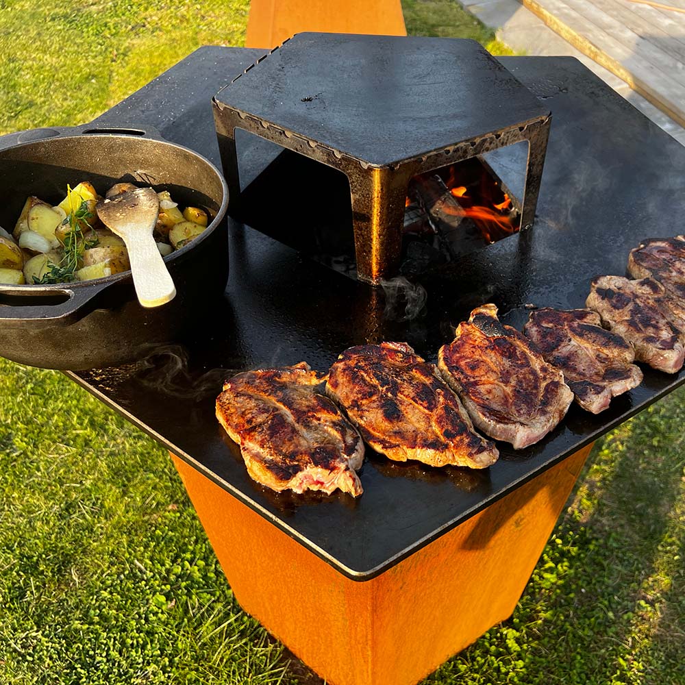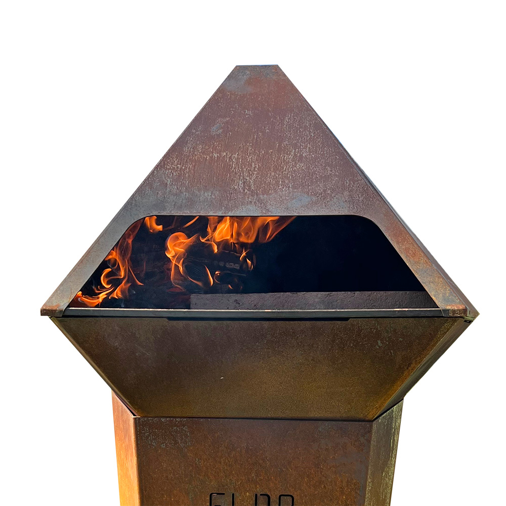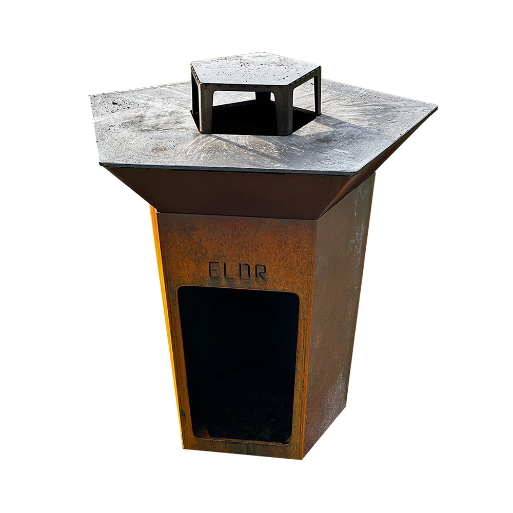 Bas och balja består av 3 mm cortenstål som åldras och förändras över tid till ett naturligt rostigt utseende. Baljan har en spjällfunktion där man kan justera luftflödet underifrån, handtaget når man via basen i öppningen. Häll och galler är gjort av 10 mm kolstål anpassat för stekning och kräver minimalt med underhåll i form av inoljning.