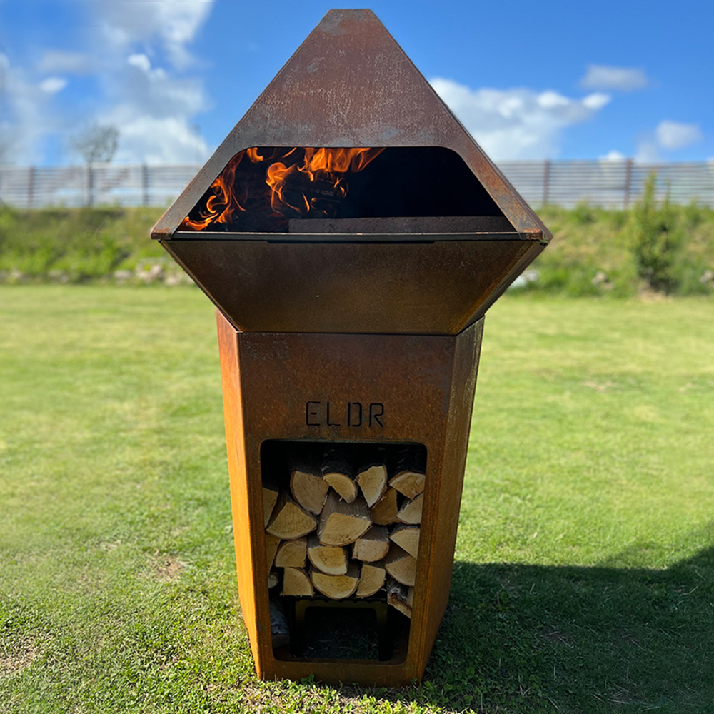 Den passar lika bra att få upp värmen vid och grilla en korv på efter en dag i skidbacken som till sommarens varma festkvällar där brasan blir ett vackert smycke. Även när ELDR inte används kommer den vara ett konstnärligt alster och ett sprakande tillskott i din trädgård med sin patina.