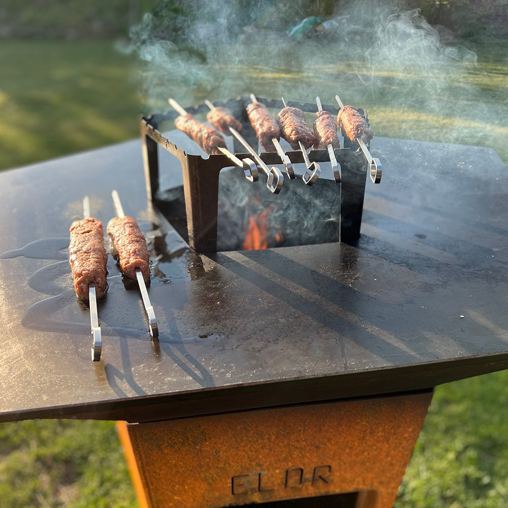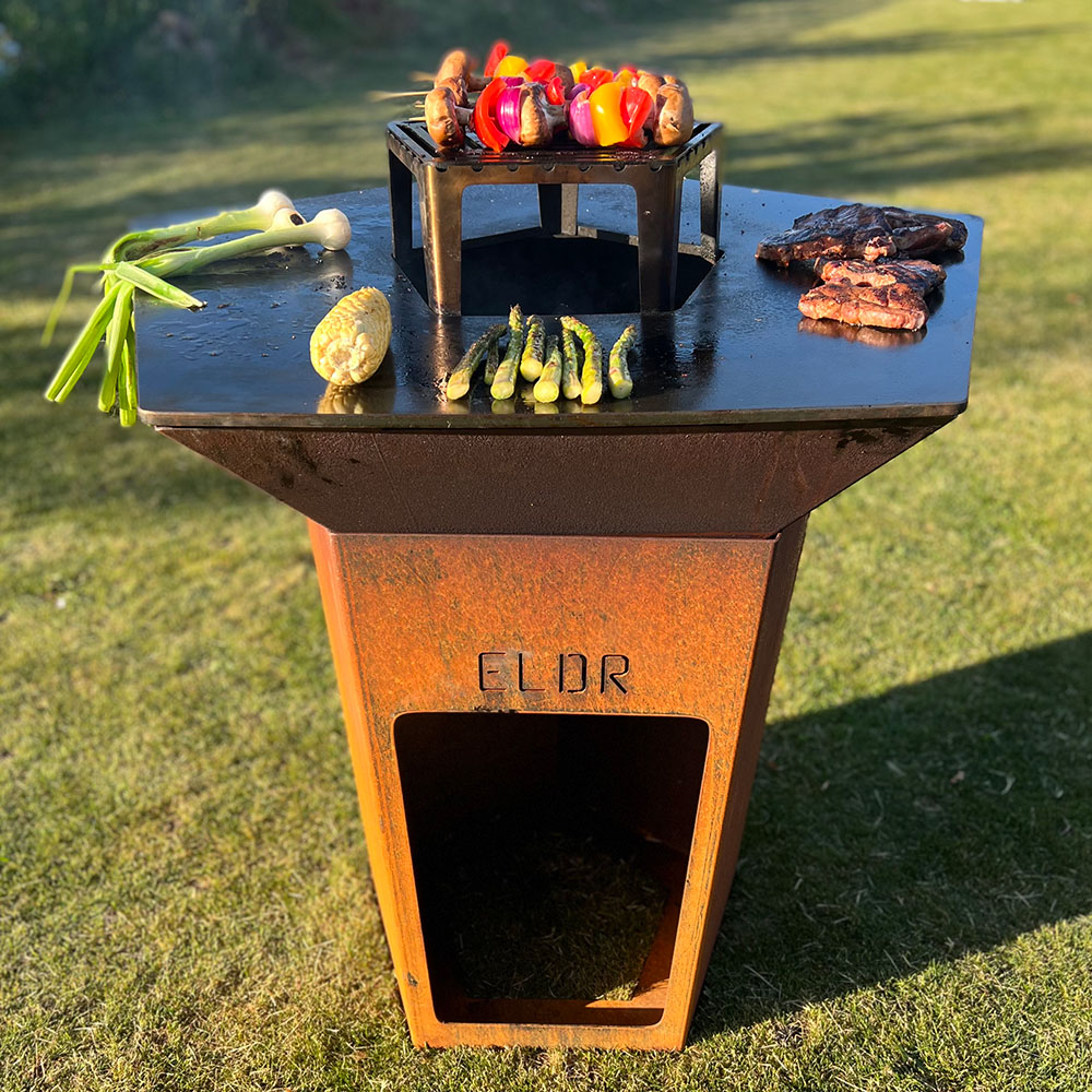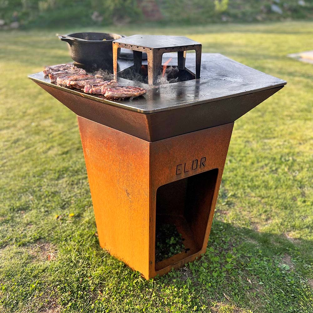 ELDR är en vedeldad eldstad med flera funktioner som kommer bli mittpunkten i din trädgård året runt. Här kan familj och gäster samlas för en mysigt värmande och smakrik upplevelse. Tänd en brasa i eldstaden för värmens och gemenskapens skull eller välkomna till en unik matlagningsupplevelse med grill och stekhäll på ELDR.