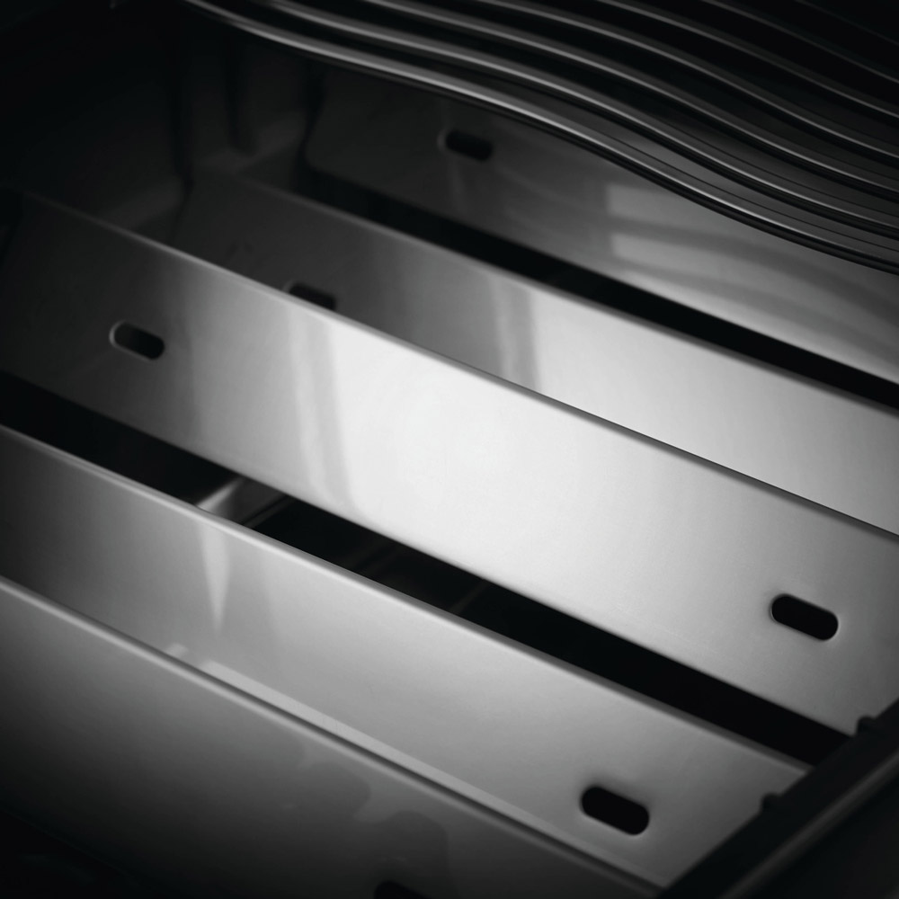 De fyra högkvalitativa brännarna i rostfritt stål har en total effekt på 16,6 kW och är inbäddade i det robusta brännarhuset i gjutet aluminium. Det unika värmefördelningssystemet gör denna grill oumbärlig för nästa grillfest. Och med SIZZLE ZONE-brännaren förbereder du grillade wokrätter och biffar med lätthet. Den infraröda sidobrännaren når snabbt upp till 800 °C och garanterar en perfekt yta på köttet. Gasoltuben förvarar du i det praktiska underskåpet och verktygen har du alltid nära till hands på respektive sida.