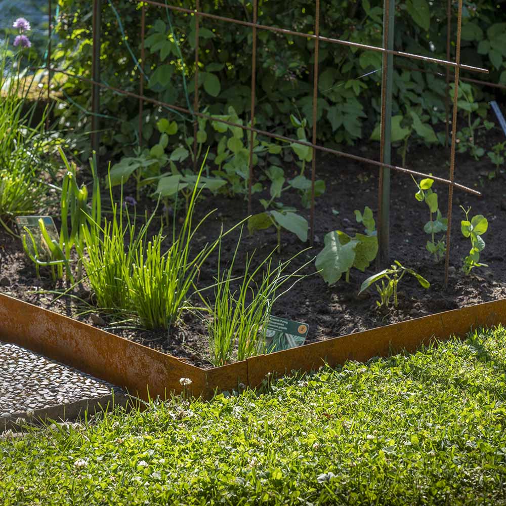 Välj mellan ett obehandlat kantskydd som kommer att rosta till en rödbrun nyans som blir vackrare med tiden eller välj det mer stilrena antracitgråa kantskyddet som är pulverlackerat.