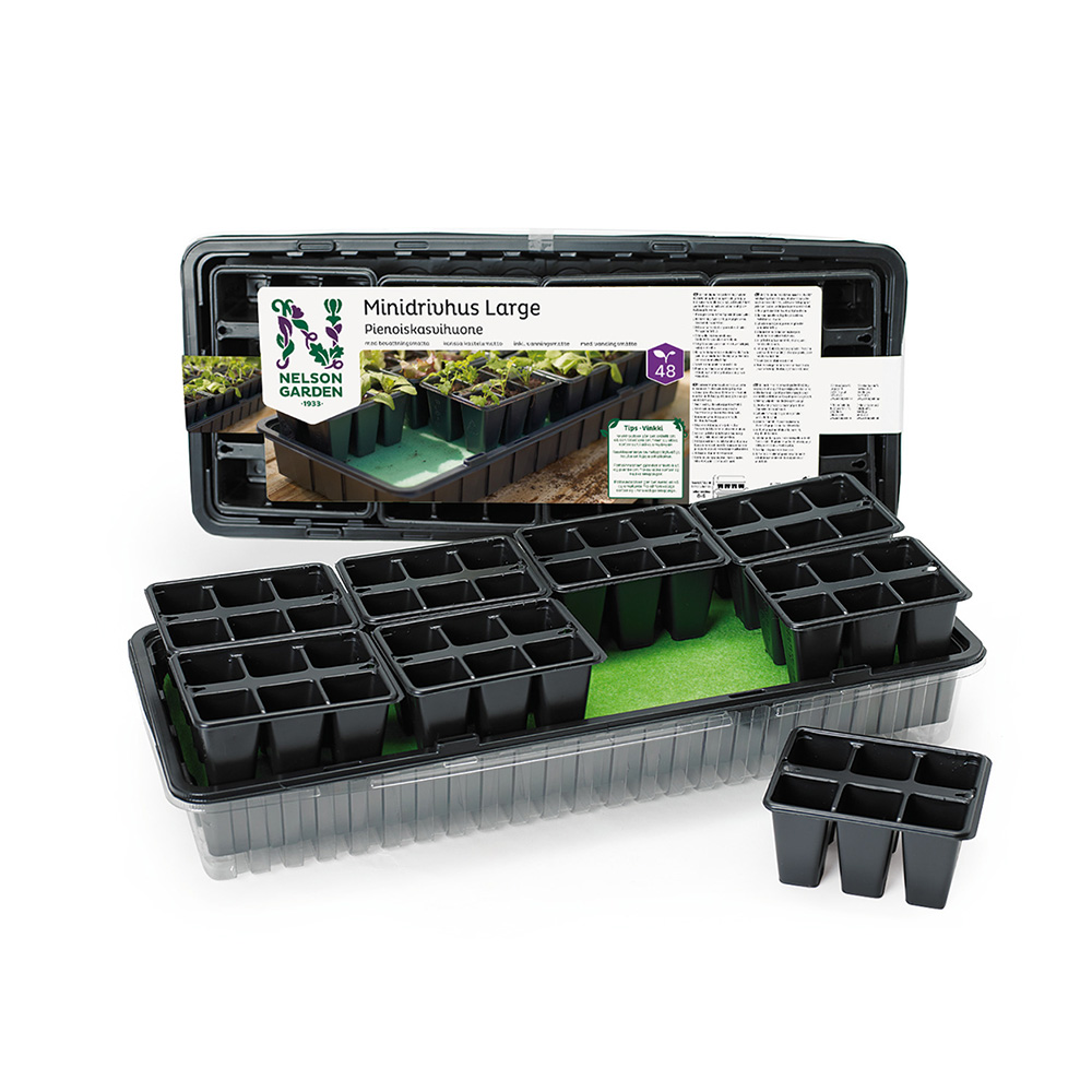 Stort och stabilt minidrivhus med bevattningsmatta vilket förenklar din förodling. 8 stycken krukinsatser med 6 celler medföljer.