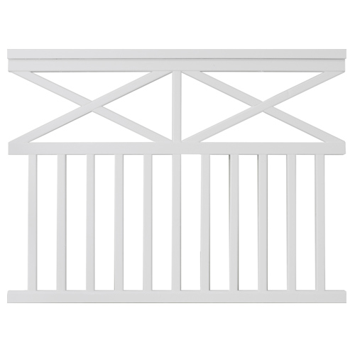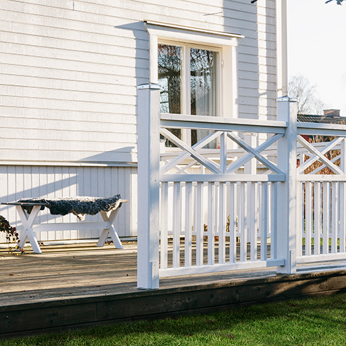 Vårt vitmålade altanräcke har en stilren design som passar de flesta trädgårdar och hustyper.