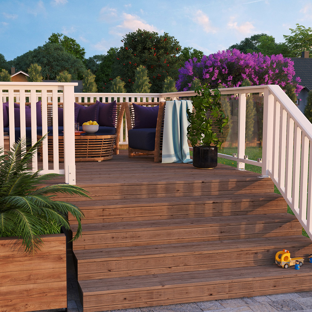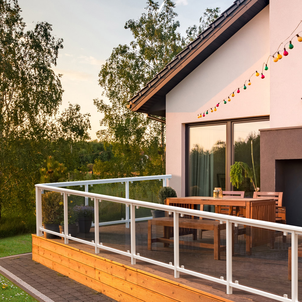 Räcke med ram i trä och klar glasskiva som släpper in maximalt med ljus. Du får ett öppet och modernt uttryck runt altanen.
