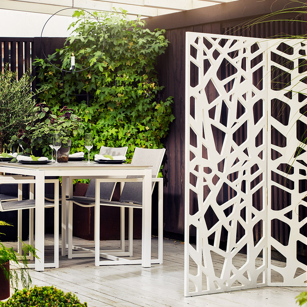 Skärmen utgör en fin detalj som den är eller som spalje på en vägg. Bara att skruva i skärmen eller hänga upp den på en krok.