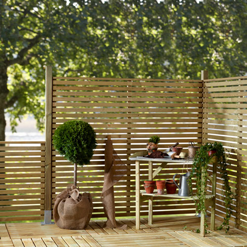 Stilren och träskyddsbehandlad skärm i gran, fungerar perfekt som vindskydd eller för att rama in trädgården. Placera skärmen runt uteplatsen eller runt uteköket. Finns tillgänglig i färgerna svart, vit och naturfärgad (Impregnerad).