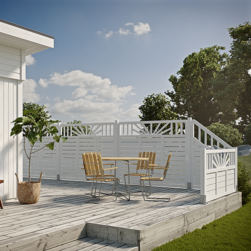 Vitmålad skärm som gör att uteplatsen får en ljus och fräsch känsla.
