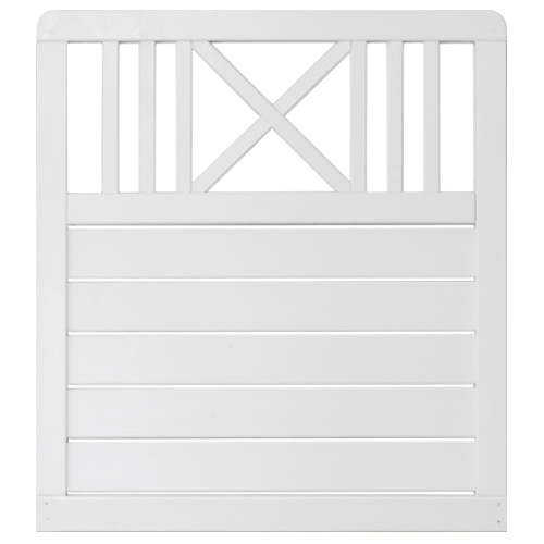Vitmålad skärm som varvar liggande paneler med ribb- och kryssmönster upptill.