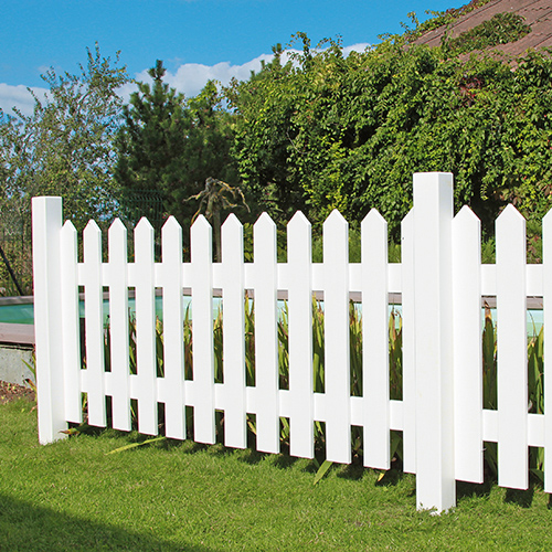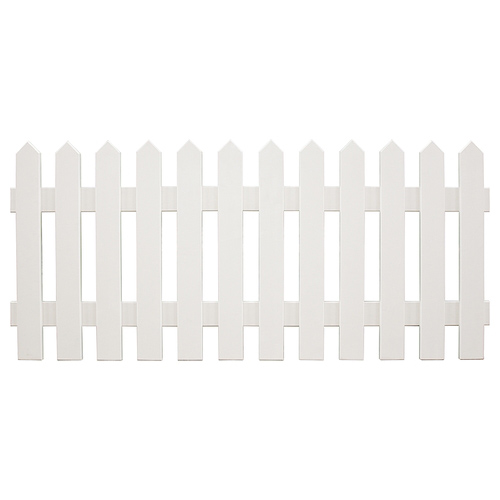 Ett vitmålat staket i klassisk stil, vilket ramar in hela eller delar av trädgården.